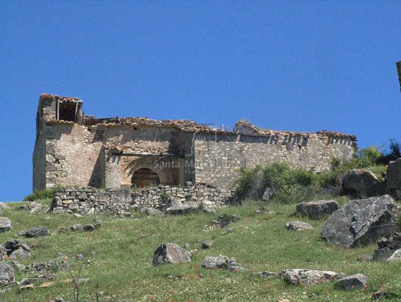 LA QUE FUE IGLESIA PARROQUIAL DE MATAS nos da la bienvenida en el flanco oeste del caserío; las demás casas que aún se conservan en ruinas se disponen a lo largo desde la iglesia hacia el Este. El templo, de tipología de nave única rematada con ábside semicircular y espadaña a los pies, sigue el modelo típico del románico rural de Guadalajara. Se construyó en mampostería con remate de sillarejo irregular en las esquinas. En el exterior del muro norte y en parte del alero de la cabecera, aún es visible una hilera de canecillos sin decoración que sustentan la cornisa realizada en piedra caliza. Todo el edificio estaba cubierto por un tejado a dos aguas con teja de cerámica curva. El acceso se realiza en el frente meridional con una portada cobijada por un cuerpo adelantado, a modo de pórtico, de sillarejo. Se resuelve mediante dos arquivoltas de medio punto sin decoración más allá de sus molduras. Apoyan en las mismas jambas y pilastras, la exterior con baquetón. Junto a esta portada se dispone un cuerpo cuadrangular adosado que funcionaría como sacristía cuando el templo contaba con culto. A los pies se dispone la espadaña, formada por un sólo cuerpo rematado en triángulo, donde se encuentran los dos arcos de medio punto que albergarían las campanas. Adosado a éste estaba hace algunos años un palomar cuadrangular que se ha ido cayendo junto con la cubierta de madera. El interior se encuentra prácticamente arruinado: la nave se separa del presbiterio mediante un arco triunfal rebajado que se apoya sobre medias columnas de capiteles que aún dejan entrever decoración foliácea. No sabemos si este arco sería el original románico, aunque tal vez lo más lógico sería pensar en una reforma posterior, como ocurre en otra iglesias de la misma tipología, como San Pedro ad Víncula de La Miñosa. A los pies se situaba un coro alto de madera y el principio de un husillo para ascender a al palomar y a las campanas. En el museo diocesano de Sigüenza se conservan, procedentes de Matas, la pila bautismal y una talla románica de la Virgen, de las que hablaremos en el apartado concerniente al museo. La cronología de esta iglesia es difícil de precisar, si bien su historia nos habla de su inclusión en el Común de Atienza, lo cual nos daría una fecha cercana al siglo XIII.