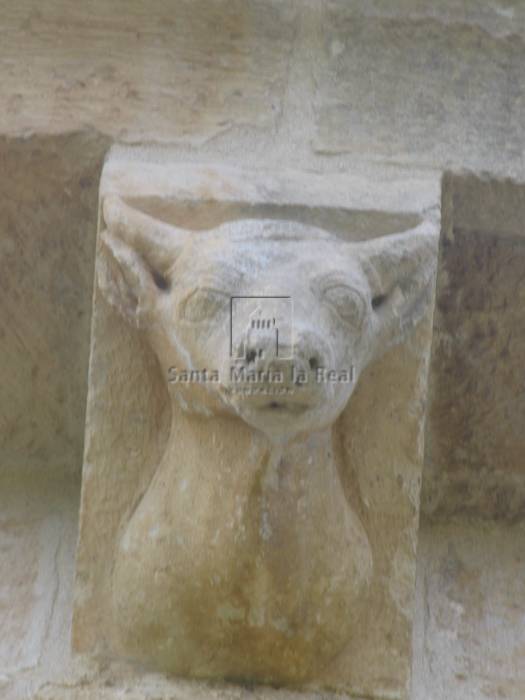 NINGUNA NOTICIA DOCUMENTAL justifica el esmero que se puso en la edificación y especialmente en la ornamentación de esta pequeña joya del románico rural. Al parecer fue en origen la parroquia de un despoblado denominado Ciriza, del que queda el topónimo Casas de Ciriza; allí existió una iglesia dedicada a Santa María. Lamentablemente, carecemos de documentación de época románica. Como hemos adelantado, entre Azcona y Ciriza había una cantera que al menos parcialmente llegó a manos de Irache en 1285. Martínez de Aguirre plantea que el magnífico estado de conservación de las esculturas de la ermita lleva a pensar si no pudo proporcionar esta cantera piedra especial de talla para las obras de Irache, lo que justificaría que escultores de muy notable calidad, responsables de las obras del cenobio y que por tanto habrían trabajado en dicha cantera, participaran en la ejecución de un templo por lo demás humilde. Estructuralmente se trata de una iglesia de una sola nave, restaurada en los años noventa de siglo pasado, con ábside semicircular al exterior y al interior. El mencionado ábside se divide en tres paños mediante dos esbeltas columnas con capiteles figurados que apoyan en basas con toro y escocia, y éstas, a su vez, sobre un minúsculo zócalo. La zona de la cabecera se distingue de la nave mediante dos potentes contrafuertes, y en los muros laterales apreciamos buen sillar en el de la epístola, en tanto que en el del evangelio y en el hastial se utiliza el sillarejo, tal vez fruto de reformas posteriores. Presenta muy buena sillería en casi todo el conjunto, llegando a unos 27 cm de altura cada hilada en la parte inferior del ábside (conforme gana altura va disminuyendo el tamaño de la cantería). En la zona exterior del ábside, apreciamos apenas cuatro hiladas regulares desde el zócalo hasta los dos sillares menores que marcan el arranque de la ventana axial. El alzado exterior de la ermita culmina en una serie de canecillos de extraordinaria decoración en el ábside, y lisos -a excepción de uno en el muro de la epístola- en el resto de la edificación. Por último, sobre los canecillos hallamos la típica cubierta a base de lajas de piedra. La ventana del ábside presenta arco de medio punto ornamentado con una chambrana a base de preciosos roleos. El arco apoya sobre dos columnas. La de la izquierda posee un capitel decorado mediante una pareja de grifos, cuyos cuerpos convergen hacia el centro, aunque las cabezas se vuelvan hacia el dorso; elementos florales ocupan el centro y las esquinas. El capitel de la derecha incorpora arpías, con cuerpos divergentes y cabezas vueltas convergiendo hacia el centro, acompañadas de tallos que a partir de un tronco que brota en el eje rodean sus cuerpos. Aunque resulta evidente en ambos casos la influencia de Irache, el segundo tiene un desarrollo muy similar a uno de los capiteles situados en el interior del ábside central de San Miguel de Estella, concretamente el número 16 de los publicados por Martínez de Aguirre, lo que evidencia una autoría común. Los cimacios ofrecen otro diseño de roleos, igualmente diestros, bien con bolitas, bien con fleurs d’arum. Los capiteles de las columnas que flanquean el ábside presentan diferentes motivos. El de la izquierda, por delante de un fondo de acantos, nos enseña un precioso combate entre caballeros, con una dama que se sitúa en el centro. Uno acomete con la lanza mientras el otro maneja una espada. La figura central junta las manos como si rogara para que ambos combatientes no lidiaran por ella, en tanto que a un lado se sitúa otra dama contemplando la escena y al otro un personaje masculino que parece ser el escudero del caballero inmediato. Uranga puso en conexión este último capitel con uno de San Zenón de Verona, por su temática quizá representativa de una canción de gesta, con motivo de lo cual recordaba el de Roldán y Ferragut de la portada del palacio real de Estella. Ruiz Maldonado, en su estudio sobre la imagen del caballero en el románico, lo relacionó con representaciones castellanas de la paz y la tregua de Dios. Su composición, aunque notablemente más compleja, recuerda a un capitel exterior de la ventana central del ábside principal de San Miguel de Estella. El capitel de la derecha de Azcona muestra dos leones de aspecto fiero, enfrentados y dándose las garras. Uranga también relacionó la iconografía del capitel del combate de caballeros con Irache, pero es en los canecillos donde se aprecia una inequívoca vinculación iconográfica y formal con dicho monasterio, como analizó Aragonés. Y lo propio sucede con algún capitel de San Miguel de Estella, con lo que resulta indudable que miembros del mismo taller intervinieron en las tres iglesias. Casi todos los canecillos tienen su correspondiente modelo en el mencionado cenobio. Comenzando desde el muro de la epístola, apreciamos un fiero león en actitud amenazante, un perro rascándose la oreja, el torso de un macho cabrío, el torso de un bóvido, un macho cabrío tocando un arpa acompañado de otro animal músico flanqueando ambos una hoja de palma, un león rugiente que se lleva las zarpas a la boca, un dragoncillo alado con cuernos, una cabeza de toro, un gato con un ratón en la boca, un dromedario y un hombre en actitud indecorosa identificado con la lujuria o la sodomía (ARAGONÉS). El resto de canecillos, como el juglar, de aspecto morisco, tocado con gorro de locos, la Virgen con el Niño y la figura femenina exhibicionista, no aparecen, sin embargo, en Irache. Un último canecillo del ábside, también con su antecedente en Irache, es muy interesante ya que muestra un personaje masculino calvo y barbado que lleva su mano derecha a la mejilla, señalando con el índice justo debajo del ojo, mientras sostiene con la izquierda una bola con inscripción en la que se ha leído SANSO GARCIA, El primer nombre ya fue atribuido por Biurrun al maestro constructor del conj