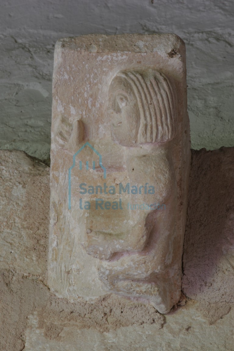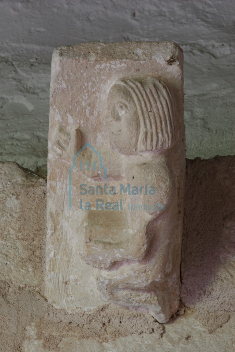 EN EL EXTREMO MERIDIONAL y a cierta distancia del caserío, rodeada de eras, se emplaza la iglesia parroquial de esta bella localidad serrana, que conserva en lo fundamental su fábrica románica, notablemente alterada por los añadidos y reformas dieciochescas. Se trata de un modesto templo de nave única a la que se acoda una cabecera de testero plano, con portada abierta en un antecuerpo del muro septentrional -hacia el caserío- y espadaña sobre el hastial, el conjunto levantado en mampostería con refuerzo de sillares en esquinales y encintado de vanos. Al interior, la cabecera presenta los paramentos laterales recorridos por arquerías ciegas, respectivamente con dos arcos de medio punto que apean en una pilastra cen tral, coronada por imposta abiselada, del mismo tipo de la dispuesta en el arranque de la bóveda de medio cañón que cubre este espacio. El testero aparece completamente recubierto por un retablo barroco presidido por la talla de la santa titular, que condena así la ventana abierta en el eje. Ésta sólo se manifiesta así al exterior, rodeando a la saetera un arco de medio punto abocelado sobre cimacios moldurados con bisel y una pareja de columnas acodilladas rematadas por sencillos capiteles vegetales de hojas lanceoladas y nervadas que acogen bolas en sus puntas, completando la cesta otras dos bolas en cada frente. Rodea a este arco otro liso, y sobre éste, una chambrana ornada con triple hilera de billetes. En el sillar que cierra a modo de tímpano el arco, se grabó rudamente un arco con despiece de dovelas. Da paso a la cabecera desde la nave un arco triunfal de medio punto doblado, que apea en sendos machones con semicolumnas adosadas, alzadas sobre podium. Muestran las columnas basas de perfil ático sobre finos plintos, con grueso toro inferior facetado y con garras, coronándose por sencillos capiteles vegetales de cestas troncocónicas ornadas por hojas avolutadas con florones de cuatro y seis pétalos. En el paramento exterior del testero es claramente visible el recrecimiento que sufrió la cabecera a mediados del siglo XVIII, datado epigráficamente en el dintel de la ventana abierta en el muro sur: AÑO DE 1744, y que configuró la actual cubierta a cuatro aguas, notablemente más elevada que la de la nave. Cúbrese hoy ésta con una armadura de par y nudillo con almizate, aunque a los pies son visibles los canes sobre los que apeaban sendos cuadrales en esta parte occidental, por lo que parece que la estructura original combinó la actual con una de lima simple sobre el coro. Probablemente también la nave fue reformada en el siglo XVIII, a tenor de la línea de cornisa que parece entreverse en la parte más occidental de su muro meridional, en cuya mampostería observamos reutilizado un fragmento de imposta o cimacio románico. En el último cuarto de la misma centuria se adosó, al norte de la capilla mayor y con acceso desde ésta, una sacristía de planta cuadrada y cubierta por cielo raso, construida también en mampostería. Sobre el dintel de la ventana abierta al este, una cuidada inscripción reza: HIZOSE / SIENDO CVRA / D(O)N FRAN(CIS)CO ADRA/DOS ´ AÑO DE 1778. La portada, como dijimos dispuesta en un antecuerpo de sillería del muro septentrional de la nave, es el elemento más destacado del conjunto. Consta de arco de medio punto liso rodeado por dos arquivoltas, la interior ornada con grueso baquetón y la exterior lisa, rodeándose por chambrana decorada con puntas de diamante. Apea el arco en jambas de aristas matadas por boceles, mientras que la arquivolta abocelada lo hace en sendas columnas acodilladas, habiendo desaparecido la occidental, cuyo lugar ocupa una pila aguabenditera dieciochesca. La columna que resta se corona con un capitel ornado con una pareja de aves de largos cuellos entrelazados picándose sus largas patas, sobre fuste monolítico y basa ática con plinto. Las impostas que coronan jambas y columnas se molduran con listel y bisel, disponiéndose en éste último rosetas tetrapétalas inscritas en clípeos. Coronaba el antecuerpo un tejaroz del que sólo restan seis de los siete canes que sostenían la desaparecida cornisa, decorados con un gallo, una fémina en avanzada gestación, un personaje masculino que, arrodillado y portando un objeto que no identificamos se dirige a la anterior con un gesto de su diestra alzada; sigue la representación de un clérigo tonsurado que, ataviado con ropas talares, parece bendecir con su diestra mientras porta un libro en la otra mano. Los otros dos canes se decoran con la representación de un cantero, ataviado con saya corta con cinturón, que alza un pico, y, en el can más occidental, una figura masculina tocada con corona que une sus manos sobre su vientre. Esta portada encierra aún otro elemento destacado, pues en el lado oriental del acceso, el listel de la imposta acoge una inscripción latina de muy difícil lectura, tanto por la descuidada grafía como por el desgaste del soporte y los grafitos posteriores que se le han añadido. A falta de un calco y un estudio más detenido, que por las circunstancias en las que se ha realizado el presente no pudimos abordar como hubiera sido nuestra intención, a duras penas acertamos a leer “...DOMINUS QUI...”, aunque sin conseguir siquiera determinar el carácter de la inscripción, que consideramos medieval y no muy alejada cronológicamente a la construcción del templo. En fecha imprecisa, se colocó ante la portada un atrio cerrado y trastero, recogiéndose en el interior del primero dos estelas discoideas ornadas con una tetrapétala y una cruz de malta, así como un fragmento de una tercera. Al menos otras tres estelas se sitúan en el entorno inmediato de la iglesia. Sobre el hastial occidental del templo, rodeado por una tapia ciega donde se disponía el antiguo cementerio, se alzó en sillería una espadaña de dudosa cronología, sobre arco de medio punto con impostas abiseladas, compuesta de dos troneras de m