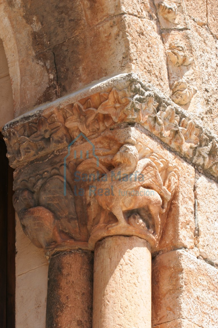 SITUADA EN EL EXTREMO SEPTENTRIONAL del caserío, dominando el núcleo desde la falda de la loma sobre la que éste se asienta, se alza este notable templo, uno de los más destacados dentro del modesto panorama artístico de la comarca. Aunque se viene considerando que en él los vestigios de la iglesia románica se reducen al magnífico pórtico, en realidad conserva de este estilo la torre y, en buena medida aunque muy modificado, el trazado del cuerpo de la iglesia, salvo la cabecera, sustituida por la actual en época moderna. Sufrió en este momento un notable recrecido la nave, así como el añadido de una capilla al norte, la sacristía al sur de la cabecera prolongando hacia el este el atrio y la transformación éste, cegándose a tal fin los arcos de la galería y habilitando la zona occidental como capilla de la Soledad. Se levantaron la nave única y la torre occidental en sillería labrada a hacha, completándose las reformas y añadidos posteriores en mampostería revestida de esgrafiado, siendo visible la reutilización de numerosas piezas procedentes de la fábrica original. La notable anchura de la nave y la ausencia de contrarrestos nos hacen pensar que recibió en origen cubierta de madera, sustituida hoy por tres tramos de bóvedas de lunetos. La torre, de planta cuadrada, se dispone en el centro del hastial occidental de la nave, comunicándose con su cuerpo bajo -hoy habilitado como baptisterio- a través de un arco de medio punto liso sobre impostas de leve nacela. Este piso inferior se cierra hoy con un cielo raso, aunque suponemos que se proyectó para recibir una bóveda; en sus muros meridional y occidental se abrieron sendas saeteras fuertemente abocinadas al interior. Se eleva la torre sin intermediación de impostas hasta el piso alto, en el que se abren cuatro vanos para campanas, uno por cara, todos de medio punto, ampliados posteriormente el sur y oeste, que prácticamente invaden la cornisa, de chaflán sobre canes de proa de nave. Da acceso a los pisos superiores otra portada de arco de medio punto, descentrada respecto a la anterior y dispuesta a la altura del coro alto que ocupa el fondo de la nave. También se mantiene, dentro de los mismos parámetros de austeridad y probablemente remontada, la portada original, abierta al sur y compuesta de arco de medio punto liso sobre impostas achaflanadas, rodeado por arquivolta lisa y chambrana de nacela. Pero es sin duda la magnífica galería porticada que recubre la fachada meridional del templo la que ha dado a éste justa fama dentro del románico segoviano, y ello tanto por la calidad de su escultura como por conservarse íntegramente. Se alza sobre un elevado podio de sillería de aristas aboceladas y debió ser construida al mismo tiempo que la iglesia, manteniéndose su cierre occidental ciego, la serie de tres arcos a ambos lados de la portada -enfrentada a la de la iglesia y emplazada con notable disimetría- y el primitivo acceso oriental, éste oculto al exterior por la sacristía. Los arcos, de medio punto y lisos, se rodean con chambranas abiseladas, apoyando en dobles columnas sobre basas áticas de amplio y aplastado toro inferior, sobre plintos. Los fustes son monolíticos, coronando sus capiteles cimacios que se continúan como imposta por todo el frente sur de la estructura, decorándose con flores hexapétalas de espinoso tratamiento que brotan de un tallo serpenteante y roleos con hojas acogolladas -en la zona occidental- o bien tetrafolias de doble corola -en la oriental-, motivo que orna también los cimacios. El tipo de las citadas parejas de hojas acogolladas acogiendo piñas son motivo infrecuente en lo segoviano y más vinculado con el románico de tierras de Soria, dándonos ya un primer indicio del origen de estos escultores. Los capiteles, parcialmente ocultos por el cierre de los arcos del pórtico, combinan los temas vegetales con los figurativos, sobre todo extraídos del bestiario, reservándose los historiados para los dos accesos. De oeste a este, vemos así en el primero una estilización vegetal con hojas nervadas muy pegadas a la cesta, de puntas rizadas en la parte alta; le sigue otro con tallos entrelazados entre los que se disponen racimos, figurándose el siguiente, sobre fondo de hojas de puntas acogolladas, con dos híbridos de cabezas humanas, cuerpos de ave y escamosas colas de reptil que, en la cara corta visible, se anudan y ascienden hasta introducirse en las abiertas fauces de un mascarón monstruoso. En este lado, finalmente, los de las columnas entregas reciben ruda decoración vegetal a base de grandes helechos de remate avolutado. La portada meridional del atrio, algo más destacada que los arcos y descentrada hacia el este, muestra igualmente arco de medio punto liso, ornándose la chambrana con dos docenas de cabecitas monstruosas de aire maléfico, la mayoría de bichas tocadas con capirote, aunque hay algunas de cánidos, relacionada como señaló Ruiz Montejo con otras de Pecharromán y Fuentidueña. Apea el arco en dobles columnas adosadas, rematadas por una pareja de capiteles dobles de espléndida factura; en el izquierdo del espectador se representó la Adoración de los Magos, realizando el más próximo a la Sagrada Familia la ritual genuflexión, aquí exagerada y acompañada del beso a los pies del Niño, éste sentado sobre María; tras ellos, como es también habitual, aparece la figura apartada y pensativa de un San José aquí sedente, tocado con bonete, apoyado en un bastón y asiendo el respaldo del sitial de la Virgen, cubierto como el suyo por un grueso paño. Ésta aparece con la cabeza tocada y coronada, los pies apoyados en un escabel ornado con brocados y sosteniendo en su regazo a Jesús, cuya cabeza se ha perdido, aunque tras ella, en la cesta, se grabó en bajorrelieve una cruz patada. Resta la pequeña diestra del niño en actitud bendicente, recibiendo en los pies el beso del primero de los magos, postrado ante él, siguiend