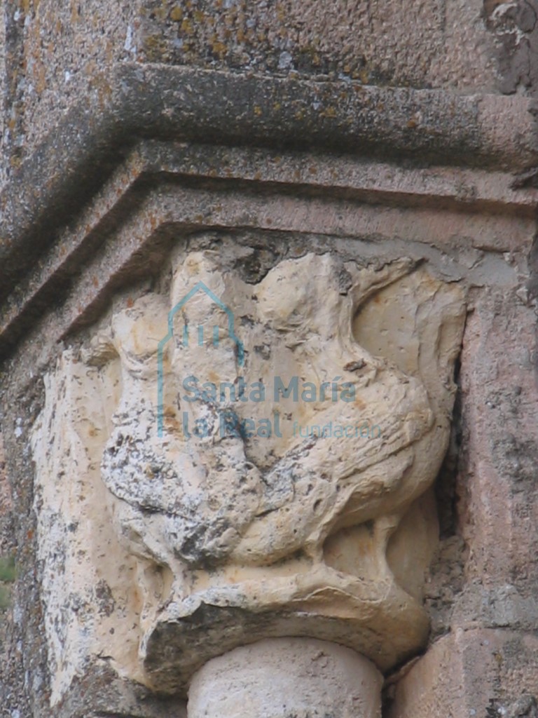 LA IGLESIA SE EDIFICA sobre unos terrenos en los que anteriormente se encontraba una pequeña ermita, la del Santo Cristo del Refugio. Los planos del templo actual se hicieron siguiendo las directrices de Jerónimo García Burgos, aunque Javier Cabello también intervino en estas obras supervisando el traslado de los restos de la ermita de Nuestra Señora de la Serna. La nueva iglesia tiene una sencilla cabecera semicircular orientada al norte, planta de cruz latina con una sola nave y crucero marcado en planta, construido todo ello con mampostería reforzada por sillares en las esquinas, vano y cornisa. Las obras de construcción de la iglesia comenzaron en 1942 y, como ya hemos apuntado antes, en ellas se reaprovecharon materiales de origen románico recuperados de la primitiva iglesia parroquial, ahora ermita de Nuestra Señora de la Serna. En el lado occidental de la nave encontramos una ventana con forma de arco de medio punto que apoya en columnitas que están coronadas por capiteles originales románicos reutilizados. En cada uno de ellos se esculpe una pareja de aves que juntan sus cabezas en la esquina de la cesta. Por otro lado, encontramos en la parte alta del brazo oeste del crucero numerosos testimonios románicos: embutidas en el muro tenemos varias metopas con estrellas de cuatro puntas y entre ellas canecillos de proa de barco, imitando una cornisa. Sobre esta especie de cornisa se han colocado dos pequeños capiteles vegetales con hojas esquemáticas con crochets en las esquinas con una pieza abilletada haciendo las funciones de cimacio. Se reaprovechan también piezas para construir una ventana de arco de medio punto con columnas y capiteles también reutilizados en los que, a pesar de la altura a la que se encuentran y del ennegrecido de la piedra, todavía se puede ver tallado en uno de ellos una sirena de doble cola, motivo decorativo muy utilizado en el románico segoviano. En el interior de la iglesia los restos románicos han sido reaprovechados principalmente en la cabecera. Se accede a ella por un gran arco triunfal de medio punto doblado sostenido por columnas acodilladas; la rosca interna lleva capiteles sencillos, uno de ellos con dos toscas hojas de acanto dobladas en las esquinas y el otro decorado simplemente con una cinta doble que se dobla formando grandes lazos. La rosca externa apoya también en capiteles más desgastados en uno de los cuales se puede ver la lucha entre dos guerreros que parecen ir vestidos con cota de mallas y portan los escudos en la mano izquierda mientras que en el otro capitel aparece una escena mitológica con un centauro colocado entre una pareja de grifos. En el presbiterio encontramos dos arquerías de medio punto cegadas que apoyan en pequeñas columnitas con capiteles vegetales muy deteriorados. También es de medio punto el arco que separa el presbiterio del ábside y que es recogido por capiteles con hojas vegetales adornadas con crochets desarrollados exageradamente que acaban ocupando casi toda la superficie de la cesta. La pila bautismal del templo, que también presenta trazas románicas, está ubicada en el brazo este del crucero. Mide 110 cm de diámetro y 101 cm de altura, apoyándose sobre un pie nuevo de cemento, y está decorada con nueve grandes gallones tumbados entre los cuales se intercalan pequeñas veneras y sobre ellos una cenefa de entrelazo que recorre toda la circunferencia de la pila.