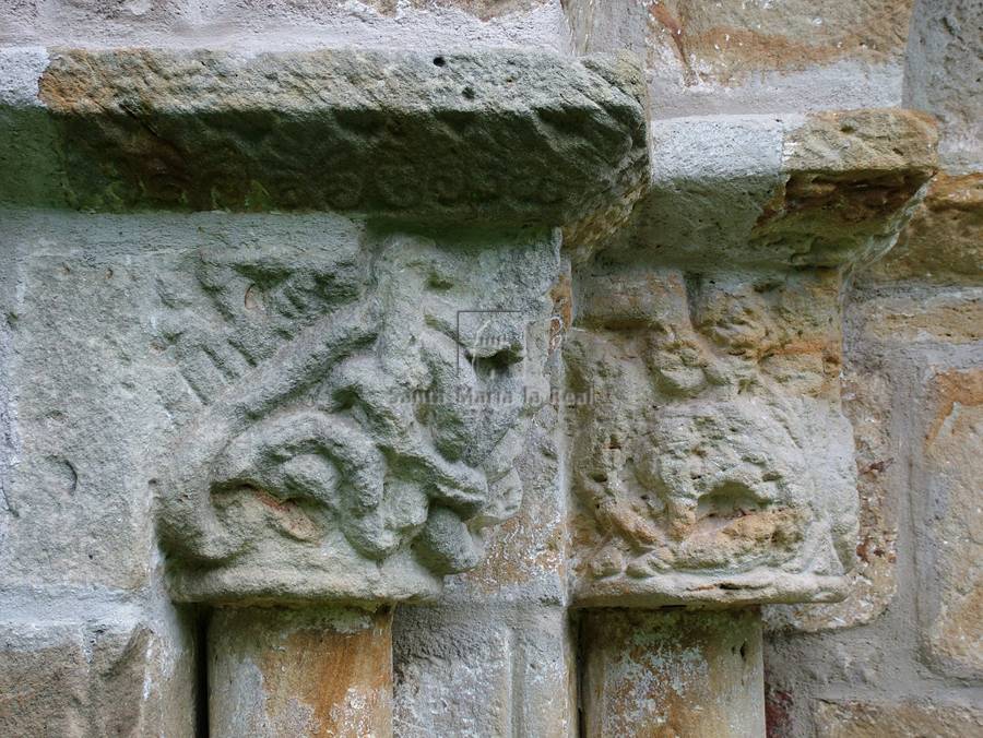 LA ERMITA SE HALLA UBICADA en las afueras de la población, y a ella se puede llegar a través de un camino asfaltado que salva el río Burunda. Sobre una loma rodeada de arbolado se emplaza el templo. Su exterior es un bloque rectangular compacto de sillarejo de mediano tamaño. El sillar escuadrado queda reservado para las esquinas y la portada. Originalmente en su lado oriental tuvo adosado un ábside semicircular que, ante la amenaza de derrumbe, fue demolido en los primeros años del siglo XIX, según afirma Arbizu Gabirondo. De este modo, su configuración primitiva habría estado más cerca de lo habitual en templos románicos rurales. Actualmente, y tras la restauración efectuada por los vecinos en colaboración con la Institución Príncipe de Viana en la década de 1990, se halla compuesta por tejado a dos aguas, cabecera recta, muro norte compacto, frente occidental perforado por una saetera -a la altura del coro-, y sur con dos ventanas rectangulares posmedievales y portada románica abocinada (3,70 m de frente por 1,16 de vano). Ésta última se halla embutida en un paramento de piedra que sobresale del muro sur 23 cm. Está formada por tres arquivoltas en arista viva y lisas de las cuales sólo la exterior está ornamentada por una decoración a base de puntas de diamante. Las externas apean en columnas con dos parejas de capiteles, frente a la interna que hace lo propio sobre pies derechos. Se aprecia talla de boceles tanto en las esquinas del resalte de la portada como las esquinas de las jambas, lo que denota su ejecución en época tardorrománica. Las columnas, monolíticas, apoyan sobre basas cuadrangulares muy desgastadas -algunas de ellas todavía conservan su primitiva decoración a base de haces de acanaladuras verticales- y plintos moldurados. El perfil de las basas asimismo evidencia una ejecución tardía. En los cuatro capiteles se cincela una decoración historiada en la que predominan las criaturas fantásticas. El primero y más occidental exhibe en ambos frentes serpientes entrelazadas y dos personajes enroscados, apenas visibles, que luchan contra ellas. En el segundo se disponen sendas arpías divergentes. El tercero y el cuarto lucen respectivamente dos parejas de grifos y de leones afrontadas; los leones, como en otros ejemplos románicos, presentan la cola enhiesta por delante del lomo. Sobre ellos, se dispone un cimacio corrido con decoración vegetal y floral donde se alternan, de Oeste a Este, palmetas, hojas palmeadas polilobuladas, combinaciones de hojas lanceoladas, trifolios y vegetación variada. Finalmente, en el más occidental, entrelazos de tallos vegetales. Y en las partes externas se alinean bandas ajedrezadas. Estos motivos alternan fórmulas del románico pleno y del tardío. En los seis canecillos que se acomodan en el frente superior del paramento, vuelve a repetirse una temática decorativa bastante similar a la zona inferior. En la primera se labra, en su parte baja, una figura alada que quizás podría ser un águila. Sobre ella se despliega un tallo vegetal formando entrelazos. En la segunda aparecen cinceladas dos figuras humanas barbadas y vestidas con faldilla trabadas en lucha, remitiendo quizás al frecuente tema de la ira representada como escena pugilística (otros combates similares también pueden encontrarse en Berrioplano, Artaiz, San Pedro de la Rúa de Estella y Santa María de Sangüesa). En la tercera se talla una cabeza animal devorando a algún otro ser que se retuerce entre sus mandíbulas. También en la cuarta aparece esculpido un monstruo antropófago; y en la quinta una cabeza animal muy deteriorada. Finalmente en la sexta podrían representarse quizás dos arpías, sin que se pueda distinguir claramente su identidad. El interior del edificio se muestra como un espacio de nave única (6,38 m de anchura por 13,42 de longitud) de morfología rectangular organizado en tres tramos apenas visibles. En 1800 se sustituyó su ábside semicircular por un muro recto. En esta época, también se reformó la parte alta de los muros e igualmente el coro y las cubiertas. En la última restauración se abrió de nuevo la saetera original ubicada en el hastial y cegada en 1629. Y se levantó el suelo de hormigón, dejando al descubierto un enlosado de cantos rodados, que sólo ha sido conservado en el área junto a la puerta. Tres capiteles, que debieron formar parte de la iglesia primitiva, son guardados en el interior del templo, bajo el pequeño retablo de madera del presbiterio. Fueron trasladados allí en la última restauración, pero anteriormente -posiblemente en el siglo XIX-, dos de ellos fueron sido incrustados en las partes altas del frente sur y el restante en el oriental. El primero, colocado al Norte, exhibe arpías en los frentes entre maraña flanqueando una cabecita humana esculpida en la esquina. Recuerda a fórmulas derivadas del segundo taller de Silos. El segundo muestra haces de tallos doblados que se extienden hacia los laterales de los frentes dejando libre, en cada uno de ellos, un espacio central donde luce una piña. En una parte de su ábaco, se esculpe una cenefa incisa en zigzag. Y en el tercero, uno de sus frentes ostenta una cabeza monstruosa de la que nace una serpiente (en un capitel de la portada de Santa María de Zamarce se esculpen cabezas de cuyas bocas brotan tallos vegetales que se entrelazan entre sí). Junto a ella, descuella una criatura con cuerpo de reptil y cabeza de loro (quizás un grifo, como los de la portada). A continuación, en la esquina, se dispone una oronda figura humana vestida con hábito que porta un libro abierto en la mano izquierda, bendice con la diestra y además lleva una taleguilla en el costado derecho. Mientras que en el siguiente frente se esculpe otra persona arrodillada que podría portar en su mano derecha un objeto colgante, quizás una honda, y que también podría interpretarse como un monaguillo con incensario como afirma Arbizu Gabirondo. En el