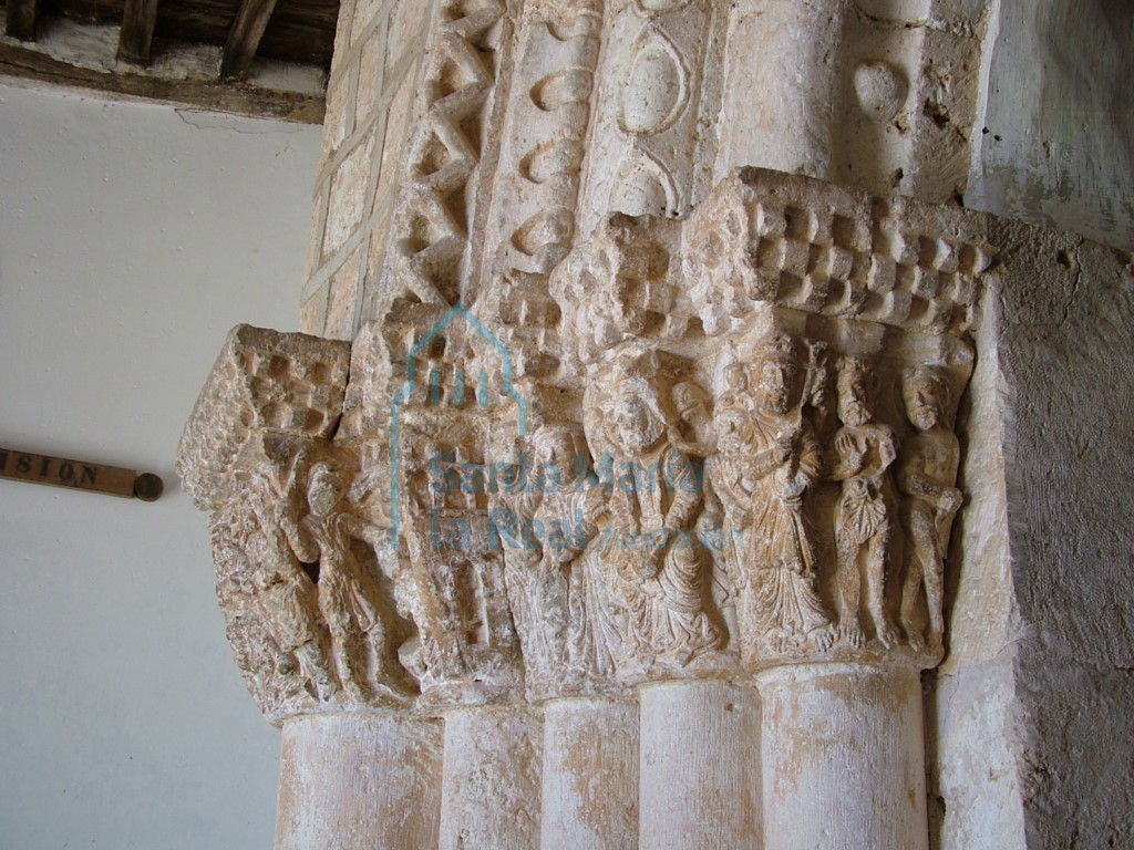 LA IGLESIA DE SANMIGUEL ARCÁNGEL, situada en la zona más céntrica del caserío que configura el conjunto urbano en el frente sur de la plaza del ayuntamiento sobre una pequeña plataforma, ha sufrido numerosas e importantes reformas a lo largo de su historia, principalmente en el siglo XVI, aunque son los vestigios románicos los que la dotan de gran belleza e importancia. El templo, elaborado en sillarejo, es de una nave rematada por cabecera cuadrangular, a la que se le han añadido dos cuerpos en cada uno de sus laterales, el de mayores dimensiones dedicado a capilla y el menor como sacristía, mientras que a los pies se encuentra la espadaña de dos ojos. El primero de los elementos que revelan el origen de San Miguel es el atrio cerrado y objeto de varias reformas ya que originariamente contaría con un vano central de acceso y tres arcos de medio con guardapolvos de medias bolas a cada lateral, de los cuales únicamente son hoy visibles dos de los situados en el flanco oriental. Así mismo en la fachada sur de dicho pórtico se hallaba otro arco de idénticas características el cual serviría de acceso y que se mantiene igualmente cegado. En el interior del espacio central de los tres en que fue dividido el atrio se encuentra resguardado el elemento más importante de la iglesia. Se trata de una de las principales portadas de la provincia y dada su situación geográfica será evidente la influencia soriana y más concretamente de la catedral de El Burgo de Osma, el principal foco de la zona. Sobre un cuerpo resaltado se disponen cuatro arquivoltas decoradas con bolas, baquetón, óvalos, perlas, arquillos y red de rombos, que se apoyan en dos líneas de cuatro columnas a las que se unen tres pares más retranqueadas, siendo la más saliente la de mayor diámetro. Ambos grupos cuentan con capiteles sin separación que se prolongan hacia el exterior en disposición abocinada. La serie situada en el flanco oriental repite un motivo decorativo continuo basado en dos aves que unen sus picos y colas formando un cuerpo ovalado rematado por una cabecilla masculina que aparece tras ellos. La ornamentación de los capiteles de las tres columnillas retranqueadas es algo diferente: en el capitel de mayores dimensiones, aunque se encuentra bastante dañado, se disponen únicamente dos parejas de aves afrontadas mientras que en los dos más exteriores los pájaros son sustituidos por hojas de acanto dispuestas en forma de cáliz. Sobre la línea de capiteles se sitúa el cimacio decorado con roleo perlado con flor en su interior. El mayor interés iconográfico se encuentra en el grupo de capiteles del flanco occidental. Bajo un cimacio decorado con el clásico ajedrezado se disponen un conjunto de cinco capiteles decorados con una serie iconográfica que nos aproxima a la catedral de El Burgo de Osma. Siguiendo los capiteles desde el interior hacia el exterior de la portada, encontramos en el primero de ellos la representación de la expulsión del paraíso: Adán y Eva cubiertos por una hoja de parra y con gesto avergonzado prestan atención a las órdenes del Señor, que sustenta una gran cruz y está acompañado por un ángel que porta igualmente otro objeto retorcido en sus manos. Los dos siguientes capiteles muestran el pasaje de la Matanza de los Inocentes con el rey Herodes sentado en su trono con un objeto en sus manos y rodeado de diablillos que le susurran el crimen al oído. A continuación dos madres muestran el dramatismo de la acción, sujetando una de ellas al niño muerto por los pies mientras que la otra parece estar en actitud de beber algún tipo de veneno, siendo, por tanto, esta escena muy similar a una de las que aparecen en la Sala Capitular de la catedral de El Burgo de Osma en la que varios soldados asesinan a los bebés y sus aterradas madres proceden a un dramático envenenamiento. La similitudes con la catedral soriana no finalizan en este punto ya que los rasgos de la talla hacen presumir una misma técnica y estética de personajes achaparrados de rostros ovalados con ojos abombados, miembros desproporcionados y pliegues toscos. El último de los cuatro, de pequeñas proporciones, alberga la escena de la Muerte de San Juan Bautista, quien arrodillado y rodeado por un entorno arquitectónico, que bien podría simbolizar su prisión, se prepara para recibir el fatídico golpe de espada de su verdugo. Finalmente la última escena que se representa en el conjunto de esta serie de capiteles es el banquete celebrado por Herodes con motivo de su cumpleaños, en el que aparece sentado a la derecha de Herodías quien ocupa la posición central de la mesa. Les acompañan otras tres figuras masculinas mientras que dos sirvientes arrodillados frente a la mesa sirven los manjares de la celebración. Es de suponer que en el centro de la mesa se encontraría la bandeja con la cabeza de San Juan Bautista, pero como consecuencia de la degradación de la piedra esto es imposible de percibir. Fuera del programa iconográfico aparecen decorados los capiteles de las dos columnillas retranqueadas con dos sirenas-pájaro afrontadas. En el interior del templo se mantiene únicamente el arco del triunfo de medio punto doblado sobre dos semicolumnas dispuestas sobre podium, con basas áticas decoradas con dientes de sierra y coronadas por capiteles decorados con iconografía animal y vegetal. En el capitel del lado del evangelio son dos leones en altorrelieve los elegidos, mientras que en capitel de la epístola son una clase de concha de marcado relieve las que se disponen en cada una de las esquinas. El cimacio que se prolonga a modo de imposta por el muro en el que se abre el arco está formado por dos pequeñas molduras y una fina línea de pequeñas puntas de diamante. El último de los elementos románicos que se conservan en el interior de la iglesia de San Miguel es la pila bautismal recientemente trasladada del baptisterio situado en el primitivo atrio a la capilla adosada a l