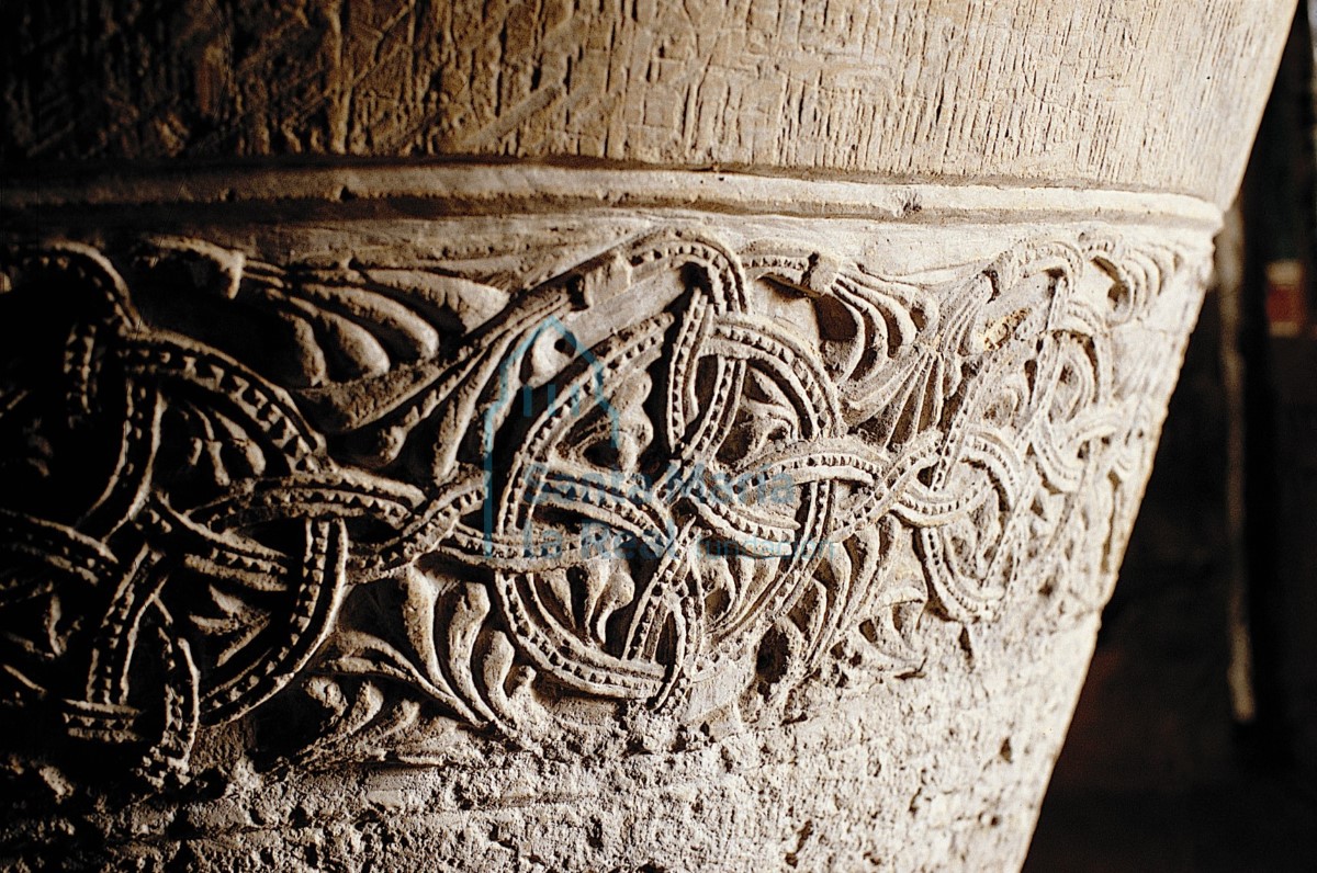 EL GRUESO DE LA IGLESIA DE SAN LORENZO se alza en buena sillería arenisca con piezas de tamaño regular. En sus fases posmedievales el tono de la piedra adquiere una tonalidad más oscura que lo diferencia claramente de la dorada arenisca románica. Esta última presenta una deficiente conservación, más evidente en la zona superior del ábside, donde ha adquirido una textura pudingosa, de tono rojizo, aunque combinada con sillares de arenisca gris de mejor compactación. En la portada occidental se utilizó la característica arenisca local procedente de canteras cercanas (Santibáñez de Ecla, Becerril del Carpio y Villaescusa de Ecla), de la misma composición que la utilizada como materia prima por los canteros de San Andrés de Arroyo. La torre-campanario, la zona occidental del pórtico y la caja extradosada del baptisterio se levantaron con mampostería y sillares angulares de refuerzo. El templo tiene planta de cruz latina con cimborrio sobre el crucero y transepto no sobresaliente en altura. Sus brazos se rematan a piñón. La nave longitudinal es de cuatro tramos y cuenta con un presbiterio rectangular. La portada principal se abre en el lado meridional. Los empujes verticales se solucionan con pilares de semicolumnas adosadas en el crucero, correspondiéndose con contrafuertes exteriores perfectamente visibles en el lado norte. Las bóvedas estrelladas del pórtico apean sobre pilares de perfil tardogótico. El ábside se cubre con bóveda de horno y el tramo presbiterial con cañón apuntado, utilizado también en la nave, reforzada mediante arcos perpiaños. El arco triunfal es apuntado y doblado. El crucero se cierra con una cúpula semiesférica sobre trompas angulares, modalidad que se utilizó en San Martín de Frómista y con posterioridad se hizo en Santa Eufemia de Cozuelos y Nogales de Pisuerga. Con estos mismos edificios podemos fijar los parámetros de comparación más certeros, tanto a nivel estructural como en los proporcionados volúmenes externos. La cúpula no constituye un cuadrángulo regular sino un rectángulo cuyos lados cortos apoyan en una cornisa sostenida por canes. El ábside románico es semicircular, presenta tres vanos de medio punto y se encuentra dividido horizontalmente en dos niveles mediante imposta. El tambor arranca de un basamento inferior constituido por una hilada doble de sillares sobresalientes. La torre de planta cuadrangular occidental y el coronamiento meridional del gran arco de medio punto abierto al pórtico, corresponden ya al siglo XVII (Navarro proporciona la data de 1642). Durante las obras de restauración llevadas a cabo recientemente se desmontó la sacristía ubicada bajo el coro lo que permitió descubrir el acceso a la primitiva torre o espadaña a través de una escalera de caracol románica. Entre el brazo meridional del crucero y el tramo de acceso a la portada se alzó una capilla cubierta con crucería cuya datación se corresponde con la propia portada, hacia inicios del XVI. A fin de cuentas, estas reformas no modificaron en nada substancial el primitivo templo románico, que iniciado en torno a las dos décadas finales del siglo XII, no debió terminarse hasta bien entrado el siglo XIII, como demuestra su portada occidental y la factura de su desmantelado Apostolado. La constatación de la cabecera y crucero descentrados en relación a la nave ratifica la existencia de dos fases constructivas bien diferenciadas durante la época medieval. El acceso se efectúa desde la portada meridional. Es de cronología plateresca y se decora con temas de candelieri, grutescos y tondi que encierran retratos de perfil, en el tímpano se representa la escena de la Deposición de Cristo. Toda la portada fue groseramente repintada en 1833. A la derecha de esta portada aparecen dos plafones cuadrangulares divididos en otros cuatro cuadrángulos con toscos motivos florales. En las claves de la bóveda que cubre el atrio se tallaron las parrillas, atributo de san Lorenzo y las llaves del apóstol Pedro. Esta portada sustituyó a una primitiva tardorrománica rematada por un friso con Apostolado, del mismo tipo que los conservados en Santiago de Carrión y Moarves de Ojeda. Todavía se mantiene en buen estado de conservación la totalidad del Apostolado, reaprovechado en las hornacinas renacentistas. Los enmarcamientos, sus peanas y doseletes en forma de venera y los coronamientos son platerescos, si bien no se despreciaron los fustes románicos que separaban a los apóstoles y que se superpusieron a pilastrillas modernas. El estilo de las esculturas románicas dista mucho de la brillantez carrionesa, recordando a los dos apóstoles conservados en el Museo Marès procedentes de Espinosa de Villagonzalo. La otra portada, abierta a poniente, refiere evidentes tipologías andresinas que permiten datarla en torno a las primeras décadas del siglo XIII. Es de una calidad muy considerable y está formada por guardapolvo y siete arquivoltas que combinan baquetones, escocias y una moldura interior zigzagueante. Las arquivoltas apoyan sobre impostas de ovas, capiteles vegetales y jambas acodilladas, dos en el lado derecho presentan arpías con capirotes y grifos afrontados perfectamente emparentables con la portada de Revilla de Santullán. Es interesante constatar cómo todas sus dovelas presentan marcas de colocación, puntualización técnica que evoca las habilidades de las cuadrillas de canteros activos en la iglesia de San Andrés de Arroyo. Como en las portadas de Santa Eufemia de Cozuelos o Revilla de Santullán, ilustra un estilo donde el bestiario tardorrománico se funde con las geométricas arquivoltas de dientes de sierra y los delicados capiteles de crochets, contradiciendo el supuesto aniconismo de los escultores al servicio de la comunidad de San Andrés. Estaba protegida por un pequeño pórtico del que aún se aprecian varios canecillos lisos y algunos mechinales para acoplar la techumbre. En las cestas de la ventana absi