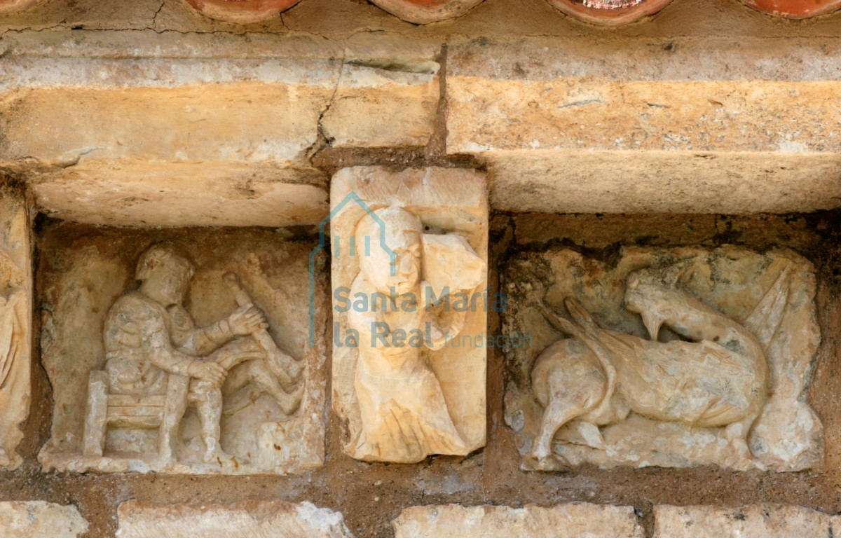 ES LA PARROQUIA DE LA ASUNCIÓN una de las iglesias rurales de mayor empaque y más interesantes de la provincia, tanto por la innegable riqueza de su apartado escultórico como por algunas de sus cualidades arquitectónicas. Sobre todo los primeros de tales atributos son responsables de que se la considere cabeza de una serie comarcal, bautizada como “taller de Duratón” por Inés Ruiz Montejo, y en la que se integran las iglesias de Sotillo, San Pedro de Gaíllos, Perorrubio, Santa Marta del Cerro, etc. La obra de dicha autora -fruto de su tesis doctoral y centrada casi exclusivamente en el estudio estilístico e iconográfico de la escultura- constituye la primera y principal aportación al conocimiento del edificio, seguida casi sin discusión por el resto de los autores que han escrito sobre el mismo, hecho que a la postre ha supuesto la práctica marginación del análisis arquitectónico. Presenta la iglesia planta basilical de generosas proporciones, coronándose la nave única con cabecera dividida en presbiterio y ábside semicircular, levantada en buena sillería de grandes bloques labrados a hacha, que en las zonas bajas alcanzan el medio metro de altura. Se alza sobre un banco corrido apenas resaltado en el bocel que lo remata, visible sólo al interior. Da paso al presbiterio un arco triunfal levemente apuntado -moldurado con dos baquetones y arista- y doblado hacia la nave por otro, también abocelado, que reposa en columnillas acodilladas en las jambas de los machones. Un guardapolvos de perfil abiselado exorna el triunfal, cuyos arcos descansan en gruesas columnas de basas áticas, con toro superior atrofiado, escocia recta y grueso toro inferior con bolas, piñas, lengüetas de caulículos o garras alancetadas, sobre plintos. Esta tipología de basa es común a todas las columnas de la cabecera. El presbiterio manifiesta en planta una cierta irregularidad de trazado, resultando así ligeramente trapezoidal. Sus muros laterales se animan con dos arcos de medio punto moldurados con boceles quebrados en dientes de sierra, doblados por cenefa de puntas de diamante ribeteadas de contario, apeando los arcos en columnillas acodilladas. Se cubre el tramo recto con una bóveda de crucería cuyos nervios, que repiten la molduración del arco triunfal, apean en columnas que se acodillan en los machones del arco y en los de los pilares que recogen el toral del hemiciclo. La antes señalada irregularidad en planta del espacio determina la del trazado de esta bóveda, especialmente notoria en su clave -ornada con una simple roseta- y en las piezas de los nervios inmediatas a ésta, recortadas a modo de cuñas para conseguir el encaje. El hemiciclo se cubre con una bóveda gallonada, generada por un toral de medio punto también moldurado con doble baquetón y arista, y reforzada por sólo dos nervios que, sin compartir clave, se entregan abruptamente a dicho arco. Estos nervios apoyan en gruesas columnas que dividen el tambor absidal en tres paños, correspondiéndose al exterior con contrafuertes prismáticos que se adelgazan en talud a la altura de los arcos de las tres ventanas abiertas en cada uno, y continúan hasta la cornisa. Constan las ventanas de rehechas saeteras de fuerte abocinamiento al interior, rodeadas tanto interior como exteriormente por arcos lisos de medio punto sobre columnas acodilladas y exornados por chambranas de triple hilera de billetes al interior y simple chaflán al exterior. Los cimacios de estos capiteles muestran perfil de listel y doble nacela, mientras que sus basas tienen perfil ático de grueso toro inferior con garras, sobre plintos. Los fustes, todos monolíticos, fueron en su mayor parte rehechos. Al sur del presbiterio se adosó una sacristía, eliminada por la restauración de los años setenta del siglo XX, que no obstante atestiguó su existencia manteniendo al interior el arco de medio punto que le daba acceso y, al exterior, la roza de la bóveda que la cerraba, cubierta que supuso la destrucción de la cornisa y canes del muro sur del presbiterio. Resulta sorprendente que la ligera diferencia de alturas entre la bóveda del presbiterio y la del hemiciclo no se manifieste al exterior, donde las sobrecubiertas están enrasadas. Los canecillos de la cabecera, de inferior calidad que los de la nave y distinta mano, muestran pencas de puntas avolutadas o acogiendo bolas, rostros humanos, un prótomo de felino devorando un personajillo del que sólo vemos las piernas, dos desgastados exhibicionistas, masculino y femenino, otra pareja en actitud procaz, etc. La profusión de columnas en el interior de la cabecera nos deja ante un rico muestrario de capiteles decorados con motivos figurativos y vegetales, en los que es posible distinguir, dentro de la cierta unidad del taller, al menos tres facturas distintas. En las cestas de las ventanas vemos, en la abierta en el paño septentrional, al exterior, una ruda arpía frontal de cabellera partida y alas explayadas y una pareja de zancudas afrontadas enredadas en follaje; al interior, los capiteles son vegetales, respectivamente de estilizadas hojas lobuladas recercando brotes acogollados uno, y piso inferior de palmetas y superior de brotes carnosos anillados el otro. En la ventana central vemos al exterior una pareja de estilizados grifos rampantes afrontados y a Sansón desquijarando al león, correspondiéndose dentro con un capitel de tallos anudados de los que penden palmetas y una pareja de descabezados équidos rampantes en el otro. Finalmente, en la ventana meridional del hemiciclo, al exterior uno de los capiteles muestra un mascarón monstruoso de afilados dientes devorando a un cérvido, mientras en el otro se dispone un enigmático personaje ataviado con túnica de acanalados y arbitrarios pliegues, que más parece un sudario, rodeado por tallos avolutados que dibujan una especie de mandorla vegetal. Los dos capiteles interiores, de superior calidad, se ornan con dos pisos de hojas