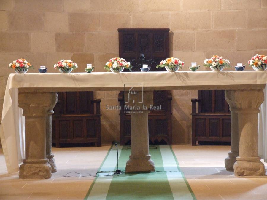 EL LUGAR DONDE SE ASENTARON definitivamente las monjas cistercienses era conocido como la “casa romana” y cumplía los requisitos de aislamiento, emplazamiento en llano y proximidad a un curso de agua, que recomendaban los monjes blancos para sus fundaciones. Es muy posible que, realmente, existiera una construcción de época antigua, de la que quedarían vestigios todavía en la zona del actual museo, lo cual no hace sino confirmar la fuerte romanización de la comarca. Todo lleva a pensar que en los inicios acondicionaron dicha casa para vivir, y a partir de ella levantar las distintas dependencias monacales, necesarias para la dignidad de la vida conventual. Hoy Tulebras es un complejo monástico que responde al programa de necesidades propias de una institución de estas características, aunque en versión sencilla, con su cerca de obra aislándola del entorno y los elementos fundamentales singularizados en la iglesia, el claustro y, en el ámbito de éste último, la sala capitular. Sin embargo disfrutar del monasterio actual ha sido labor de muchos siglos. Es importante subrayar que las monjas de Tulebras nunca poseyeron un gran patrimonio, lo que les impidió construir un monasterio de fábrica sólida y duradera como los mencionados de varones. Todo los beneficios que fueron acumulando en los primeros años los dedicaron a construir la iglesia abacial, y probablemente la sala capitular, considerados los espacios nucleares de los monasterios cistercienses, aunque sólo subsiste de época medieval el templo. El resto se fecha ya en la Edad Moderna. Desde mediados de la década de 1960 en el monasterio se han sucedido distintas campañas de restauración, comandadas por las propias monjas, que han afectado tanto a las dependencias como a la iglesia. En las actuaciones realizadas se ha buscado devolverle su original aspecto medieval, cuyo resultado apreciamos hoy. El templo consta de nave única, en cuya fábrica se utilizó el sillar. De su exterior sólo es visible al visitante el muro norte que da al compás. El muro sur, como es habitual en la arquitectura monacal, se alinea con el claustro, mientras que el de los pies se yuxtapone a dependencias conventuales y la cabecera da al huerto de clausura. El lienzo norte, muy restaurado, se articula con contrafuertes y en la cornisa aparecen una serie de modillones lisos. Queda también patente la obra de la bóveda tardogótica. En cuanto a los accesos al templo desde fuera del recinto conventual sólo existe una entrada lateral, pues debido al restringido culto público de una comunidad femenina se podía prescindir de la portada a los pies, presente en las abadías masculinas. En efecto, esta puerta, muy reconstruida, se abre en el muro norte en el tramo inmediato a la cabecera; dibuja un arco de medio punto con cuatro arquivoltas de diseños variados: la interior con baquetón de esquina; las dos intermedias, con dobles baquetones separados por media caña, y la exterior otra vez con baquetón flanqueado por media caña y la chambrana decorada con hojas cuatripétalas. Varias dovelas de la puerta están rehechas a causa del progresivo deterioro. Las columnas en las que apoyan las arquivoltas asientan en un alto podium, constan de basa circular con garras o bolas, fuste cilíndrico (dobles bajo el arco interior, evidencia de una cronología cercana a 1200) y capitel con cimacio liso. Casi todo es producto de la restauración. La decoración se centraba en los capiteles, que a nosotros han llegado muy deteriorados, por lo que algunos se han repuesto, pero se adivina que los motivos dominantes eran vegetales esquematizados en forma de palmetas, hojas grandes lisas y otras hendidas festoneadas. Los dos externos, aunque recrean temas de tradición románica, son nuevos y los siguientes han sido sustituidos por bloques lisos. Sólo son originales los dos interiores, que coronan columnas pareadas; aunque muy perdidos, se aprecia que fueron decorados con hojas hendidas y palmas, con técnica de esbozo. Esta portada mide 1,40 m de vano y 3,70 de frente. A finales de los años setenta del siglo XX el exterior del ábside circular, sólo visible desde los jardines de clausura, fue también muy restaurado. Antes de la intervención estaba articulado por cinco potentes contrafuertes (el sexto estuvo donde se abre la capilla de San Bernardo), como era habitual en las construcciones contemporáneas y evidencian los cenobios de La Oliva o Fitero. Pero al aparecer en el transcurso de las obras vestigios de fustes que recorrían los muros hasta la cornisa, se optó por su reconstrucción en sustitución de los estribos, con lo que el ábside ganó en ligereza. Únicamente se mantuvo el contrafuerte orientado al sur, pues ese muro es el que muestra un pandeo más acusado. Las esbeltas columnillas descansan en podium cúbico y basa circular y terminan en capitel vegetal inspirados en la estética cisterciense del momento. Sin embargo sólo es original el del lado norte en el que se adivinan palmetas avolutadas y piñas. En este muro, en torno a la ventana, se repite una marca de cantero similar a unos anteojos invertidos. A la altura media del ábside, en el muro axial y en los laterales, se sitúan tres ventanas de medio punto con finas columnas. El deterioro de los capiteles no impide confirmar que se terminaron tallando motivos de flora, palmas, hojas hendidas y otras vueltas en bolas, recurrentes en el momento y conforme con la interpretación esquemática habitual de la época y al gusto austero cisterciense. En general esta ornamentación vegetal es de muy escasa calidad. Encima del ábside medieval sobresale la fábrica de ladrillo de la cubierta del siglo XVI. Como es usual en estos complejos monásticos, el muro sur de la iglesia, en el que se marcan los contrafuertes, sirve de cierre a la crujía norte del claustro. En él se abren dos puertas a la iglesia, una en el tramo anterior al presbiterio y la otra a los pies. La primera, más e