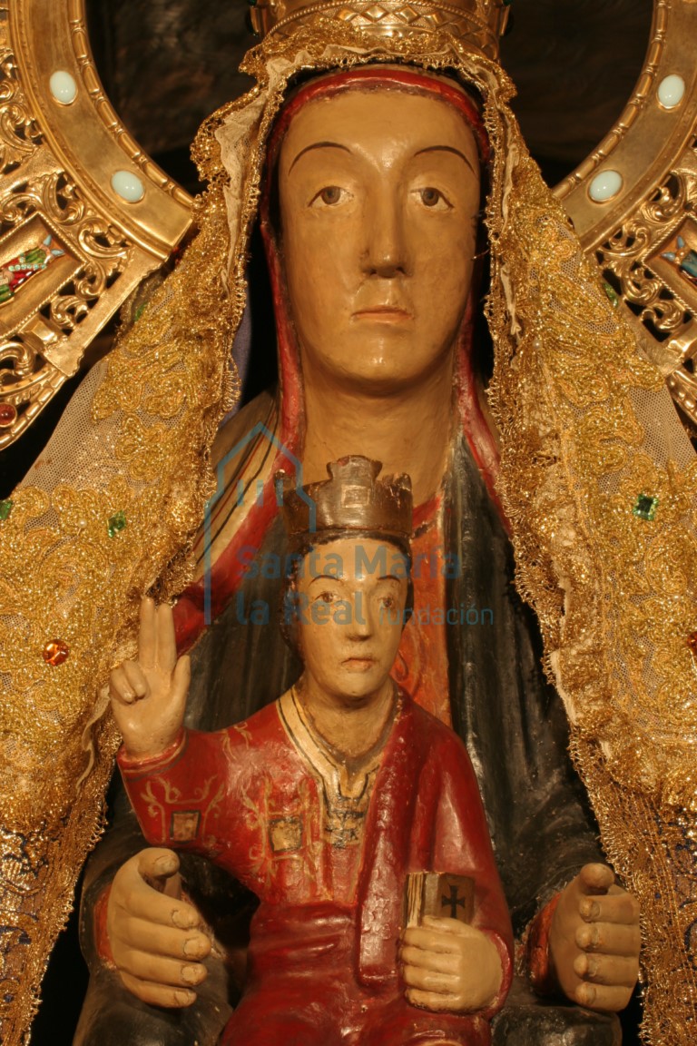 EL SANTUARIO BARROCO de la Virgen del Henar se encuentra situado a poco más de 5 km al noreste de Cuéllar y muy cercano a Viloria, ya perteneciente a la provincia de Valladolid. Según Martínez Díez ocupa el lugar en que se asentó el despoblado de Santa María del Henar, conocido gracias a la documentación fiscal de 1247, aldea en la que es posible se venerase la imagen. Actualmente preside el retablo mayor del templo sobre una peana giratoria de querubines, a la que se accede desde la zona posterior en la que se ubica un camarín del siglo XVIII. La leyenda cuenta que la figura fue traída a España desde Antioquía por San Geroteo, según la tradición, primer obispo de Segovia. Éste la depositó en un poblado cercano a Cuéllar donde permaneció hasta que sus fieles, aconsejados por San Frutos, decidieron enterrarla ante el temor de que fuera destruida por las huestes musulmanas. Tras desaparecer la población se perdió la memoria del lugar en que había sido ocultada, aunque no la de su existencia, transcurriendo así varias centurias. En torno a 1580 sería cuando una mujer reveló su situación a un joven pastor, que tras volver al lugar con su padre halló la imagen que fue imposible trasladar, lo que motivó la construcción del actual convento carmelita en aquel paraje. Se trata de una imagen lignaria, de pino, de 79 cm de alto por 31 cm de ancho y 19 cm de profundo que responde al repetido modelo medieval de Sedes sapientiae, que se reproducirá en tierras segovianas hasta bien entrado el siglo XIV. En él se muestra la figura de la Virgen actuando como trono de su hijo, quien sin relación alguna con la madre se sienta en su regazo en actitud de bendecir con la diestra. A la Virgen se le ha superpuesto corona de plata en la que aparece la figura de Cristo junto a los doce apóstoles y rico manto en época moderna. Se sienta sobre un sitial de brazos moldurados, en actitud hierática, con los brazos en ángulo recto y dirigidos paralelamente hacia el espectador, reconociéndose en ella el tipo iconográfico en el que María no toca al Niño sino que con su postura se convierte en Trono de Dios. Se repite así el ejemplo, entre otros, de Nuestra Señora del Val en Valladolid o de la enigmática “Virgen con el Niño” que se encuentra depositada en el museo de la misma capital, en cuya Guía se advierte que “procede de Cuéllar, donde se conservaba en una hornacina que coronaba una de las puertas de la muralla” como se apuntó en el tomo correspondiente de esta misma obra. Está tocada con corona real de madera, hoy oculta, que se dispone sobre un velo repintado, al igual que toda la pieza, en tono amarillento con el reborde rojizo y que llega a medio torso. Viste túnica bermeja hasta los pies de abultados y rectos plegados que comportan gran sensación de estatismo al conjunto. Sobre ella manto azulado que alcanza las rodillas, que quedan realzadas mediante someros pliegues circulares y diagonales realzando el volumen. Bajo la túnica asoman los pies, separados como es usual y calzados con chapines negros. Las manos le han sido restituidas, como puede apreciarse en antiguas fotos, datando las actuales del siglo XX, cuando fue restaurada por el artista Ángel García Ayuso siguiendo las pautas marcadas por el Marqués de Lozoya y don Luis Felipe Peñalosa. El Niño se asienta centrado sobre el regazo de la Madre. Su actitud es común en este tipo de representaciones: bendiciendo con la diestra y asiendo un libro con la izquierda. Igualmente luce corona real que repite el modelo de la que porta la madre. Viste túnica hasta los tobillos con ribete amarillo en la zona del cuello que repite los pliegues tubulares vistos con anterioridad, ceñida por un manto anudado a la cintura y que cae sobre el hombro izquierdo. Ambos rostros, de perfil ovalado, comparten el mismo tono ocre que el resto de zonas desnudas de los cuerpos. Los gestos, de evidente dulzura, junto a lo esbelto del conjunto denotan una cronología probablemente posterior a 1200 aun conservando plenamente resabios de raigambre románica.