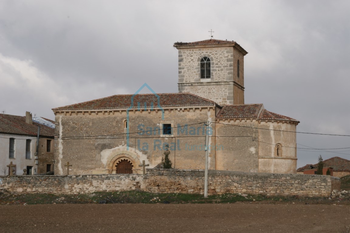 SITUADA EN EL EXTREMO SUDESTE del caserío, es un edificio de planta basilical, compuesto de nave única con torre de planta cuadrada ubicada al norte y coronada por cabecera de tramo recto y ábside semicircular, el conjunto levantado en mampostería de calicanto enfoscada con refuerzo de sillares en esquinales y encintados de vanos, salvo el cuerpo bajo de la torre, aparejado en buena sillería. El cementerio se ubica al sur del templo, envolviendo parcialmente la cabecera y parte de la nave. El tambor absidal, al exterior, se alza sobre un zócalo ligeramente saliente, recercado por una irregular hilada de sillares con bocelillo superior. Lo divide horizontalmente una imposta abocelada sobre la que se disponen las tres ventanas que dan luz a la capilla, una en el eje y dos laterales, todas de estrechas saeteras profundamente abocinadas hacia el interior, donde se muestran como arcos doblados de jambas aboceladas y fina cenefa de dientes de sierra. Exteriormente, rodean los vanos arcos de medio punto lisos que recaen en columnas acodilladas, doblados por chambranas abiseladas, todo con aire de haber sido remontado. En las ventanas laterales el remate de las saeteras se extradosa con arquitos con junquillo y fina banda de puntas de diamante. Las columnas que recogen los arcos muestran basas áticas sobre plintos y capiteles de muy sumaria decoración vegetal, con hojas lisas triangulares, otras apalmetadas y aun de tratamiento espinoso, bajo cimacios de listel y chaflán. En la central, el capitel derecho recibe dos rosetas inscritas en clípeos y entre ellas una hoja lobulada. Remata los muros del hemiciclo una cornisa de nacela sostenida por canes de idéntico perfil y lisos, salvo tres ornados con bayas, proa de nave y dos rollos. Un mayor esfuerzo decorativo manifiestan los canes del presbiterio, donde se suceden los de dos o tres rollos, bastones y nacelas, bolas con caperuza y rudos prótomos de bóvidos y un felino. Al interior, cúbrese el hemiciclo con bóveda de horno y el profundo presbiterio con medio cañón reforzado en el centro por un fajón sobre semicolumnas, que lo divide así en dos tramos, ambas cubiertas sobre imposta achaflanada. Se alza la cabecera sobre banco corrido de arista con bocel, animándose los muros presbiteriales con desiguales arcos ciegos de medio punto, los más orientales en arista viva sobre impostas de bisel y los otros con rosca y jambas baquetonadas. Las semicolumnas que recogen el fajón se alzan sobre plintos y basas de fino toro superior y garras vegetales en el grueso inferior, coronándose con rudos y desgastados capiteles, mostrando el meridional esquemática y geometrizada decoración vegetal de hojas picudas bajo ábaco festoneado y, el frontero, tres irreconocibles figuras ataviadas con túnicas de pliegues paralelos bajo cadeneta de entrelazo. Da paso a la cabecera desde la nave, ésta cubierta por moderna parhilera, un arco triunfal de medio punto doblado que reposa respectivamente en semicolumnas y en el machón, en cuyas esquinas se acomodan columnillas. Los capiteles del toral, pese a manifestar el mismo rudo estilo visto en las ventanas y presbiterio, denotan un mayor esfuerzo decorativo. El del lado de la epístola es vegetal, cubriendo su cesta con carnosas palmetas, mientras que su compañero por el lado del evangelio recibe una pareja de ángeles que sostienen en sus manos rosetas inscritas en clípeos a modo de discos solares, ocupando el espacio entre las figuras otras dos rosetas, de idéntica factura a las vistas en el capitel derecho de la ventana central. La nave, aunque en lo constructivo muestra en sus muros de calicanto una clara unidad respecto a la cabecera, se separa netamente de la tosquedad hasta ahora analizada en el apartado decorativo. Presenta en el hastial occidental, rehecho a la altura de las restauradas cubiertas, una hoy condenada portada bajo saetera rodeada por arco de medio punto. Se abre este antiguo acceso en el propio espesor del muro, sin antecuerpo que le dote de profundidad y recercándose simplemente el vano con sillería. Consta de arco de medio punto liso rodeado por chambrana de triple hilera de billetes, sobre impostas de tallos ondulantes acogiendo brotes carnosos en los meandros. Pese a la simplicidad de los motivos, su factura denota una mano más experta que la que labró los relieves del ábside. Lo mismo ocurre con la portada principal, que se abre en un antecuerpo del muro meridional de la nave, también bajo una saetera románica -ésta parcialmente cegada por un reloj de sol- y en este caso víctima de una reciente y no muy afortunada intervención. Consta de arco polilobulado con la rosca ornada con rosetas octopétalas en clípeos y dos arquivoltas, la interior moldurada con grueso baquetón entre biseles y la exterior con haz de tres boceles quebrados en zigzag, dibujando dientes de sierra. Tanto ésta peculiar decoración como la presencia del arco polilobulado hermana al taller escultórico de El Olmo con producciones del denominado por Ruiz Montejo como “taller de Duratón”, tales las de Duratón, Sotillo, Turrubuelo, Castroserna de Arriba, Perorrubio, etc. A la misma responde también el estilo de la imposta de acantos y palmetas trepanados, de fuertes escotaduras, y de los capiteles que coronan la pareja de columnas acodilladas que recogen la arquivolta interior, ornados respectivamente con acantos acanalados y dos pisos de hojas nervadas, tratamiento y motivos característicos también de otros edificios del taller como Perorrubio. Sus fustes son monolíticos y reposan en unas muy desgastadas basas áticas y plintos achaflanados. La profunda erosión de las jambas y la pérdida de la zona superior de la arquivolta externa -donde las dovelas habían sido sustituidas por sillares- motivaron que durante la última restauración del edificio en 2000 se decidiese el completamiento de la misma, de un modo que transgrede el principio de la diferenciación entre lo original 