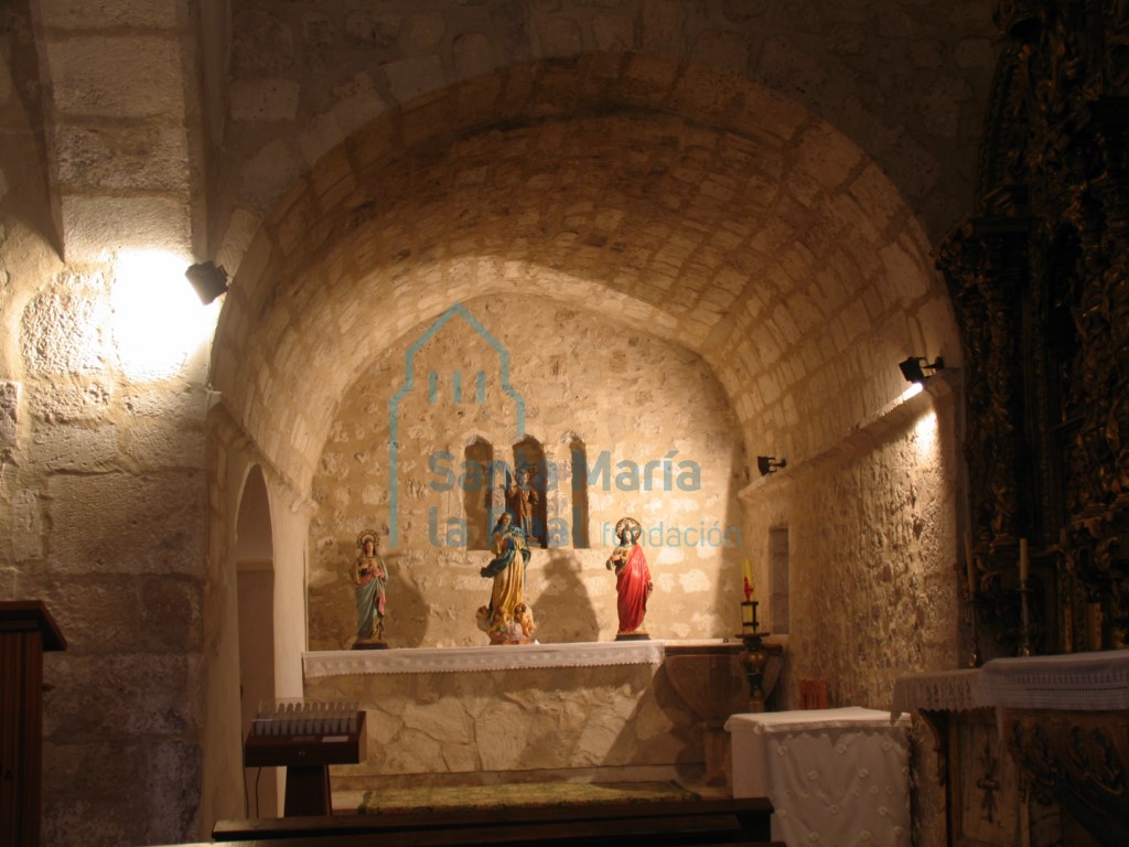 LA IGLESIA DE SAN NICOLÁS de Fuentepiñel se encuentra situada en la espaciosa plaza mayor de la localidad, en un pequeño altillo salvado mediante unos pocos escalones que dan acceso al atrio, y compartiendo espacio urbano con el edificio de Ayuntamiento. Está construida en mampostería en su mayor parte aunque reforzadas las aristas y puntos más débiles con sillares. Son escasos sus restos románicos ya que ha sido reformada en varias ocasiones, afectando esto de manera sustancial a su primitiva estructura. Aquella primera iglesia románica respondía probablemente a un sencillo modelo de nave única y cabecera canónica al interior con su tramo recto presbiterial y hemiciclo, a juzgar por el perfil del retablo barroco que hoy la ocupa. Este ábside se cubría con bóvedas de medio cañón y horno pétreas que arrancaban de una imposta de listel y nacela, hoy sustituidas por bóvedas de yeso barrocas, si bien del mismo perfil. Aunque muy retocados sus muros, al igual que el arco triunfal, se articula el tramo recto mediante un vano de medio punto remontado por costado. Al exterior bien podía manifestarse, al igual que hoy, mediante un testero recto emparentando así con el modelo de las cercanas San Pedro en Fuente el Olmo de Fuentidueña, Torrecilla del Pinar o San Miguel en San Miguel de Bernuy, aunque en estos casos la solución se justifique por la superposición de la torre a la capilla mayor, caso que no parece este. Según Cuéllar Lázaro, tras revisar la documentación del archivo parroquial, la torre debía encontrarse en el costado nordeste del templo y se encontraba en 1653 en estado ruinoso. Anexa a la cabecera por el sur se dispone una pieza cuadrangular que debió funcionar como capilla o sacristía, cubierta mediante bóveda de medio cañón dispuesta de forma longitudinal a la nave y que arranca de una imposta en nacela similar a la de la capilla mayor. Muy probablemente, también al sur, se abriría un pequeño pórtico hoy desaparecido e incluido su espacio en el cuerpo de la nave. Al exterior se conservan muy deteriorados cuatro canecillos de la capilla mayor que acogieron imágenes hoy anónimas y varios más de la antigua capilla o sacristía, todos a mediodía. En la segunda mitad del siglo XVI se realizó la reforma estructural del espacio interior del templo tantas veces vista en la provincia: se incorpora como segunda nave al sur el que fuera antiguo pórtico, abriéndose el muro de este costado mediante dos grandes arcos de medio punto y capitel toscano que no parecen anteriores a la mitad del siglo XVI, quedando en uso como ábside la anterior capilla lateral. Posteriormente, a mediados del siglo XVII, se compone el acceso meridional (1658) cegándose la antigua portada de medio punto con despiece de grandes dovelas y se eleva la nueva torre a los pies. Por último, posiblemente a finales del XVIII, se sustituye la cubierta, que por lo repetido del modelo sería de madera, por una esquifada de yeso. Igualmente se procedió al blanqueo general de la iglesia ocultando anteriores pinturas murales que aun reapareciendo en las restauraciones de mediados de los noventa se picaron sin compasión al igual que las molduras barrocas de la bóveda del presbiterio. Atendiendo a sus escasos restos y a su aparición en los documentos fiscales emitidos por orden del cardenal Gil de Torres en 1247, hemos de pensar en esta fecha como término ante quem para el comienzo de la obra.