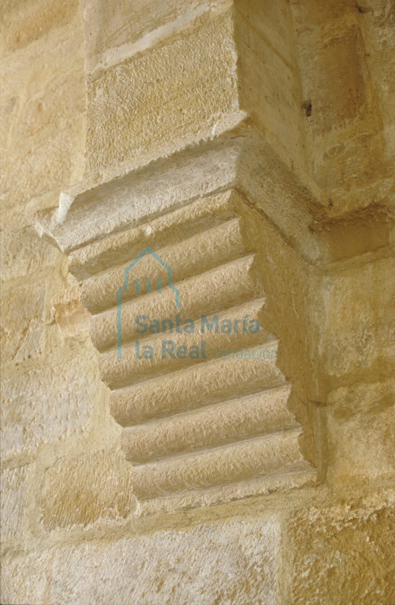 LA IGLESIA DE SANTA CECILIA -a unos de 920 m de altitud- está ubicada en la ladera sureste del cerro del castillo, a los pies de los restos de la fortaleza medieval que lo corona. Ocupa por tanto un puesto preeminente desde el que se domina la totalidad del núcleo urbano aquilarense. Desde un punto de vista tectónico, el edificio se asienta sobre un terreno de escasa estabilidad, que hubo de afectar profundamente a sus estructuras, provocando no sólo la aparición de grietas en sus muros, sino una cierta inclinación de la torre. Muy probablemente estas deficiencias en el asentamiento de sus cimientos fueron la causa del hundimiento de determinadas zonas del edificio original. En la década de 1960, el entorno del templo fue sometido a una serie de trabajos de consolidación y reestructuración sobre la base de un sistema de grandes muros de contención que a modo de terrazas posibilitó, además, la creación de un espacio habilitado como aparcamiento. En la actualidad el edificio carece de función litúrgica concreta, siendo utilizado de forma esporádica para determinadas celebraciones. Huidobro y Serna señalaba que al parecer fue parroquia de un barrio -el de Santa Cecilia- ya desaparecido. Las primeras noticias sobre los orígenes del templo son muy confusas. El autor del Catálogo Monumental hace alusión a una lápida en cuyo texto, al parecer, se hacía constar la fecha de su construcción: “IN : ERA : T : LXX : VIIII : REGNANTE : IN CASTELLA ET LEGIONE : FERDINANDO : REX : ET : SANCIA : REGINA : UXOR : EJUS : CONSUMATA : EST : ISTA : ECCLESIA”. Como ya hicieron Rodríguez Muñoz y García Guinea podemos cuestionarnos su existencia, puesto que no se conserva ni lápida ni documento. La inscripción nos habla de un edificio que -aunque fuera realizado en 1041- nada tiene que ver con el actual. En el llamado Testamento de doña Ofresa, recogido por González de Fauve, encontramos la referencia más antigua al barrio de Sancta Cecilia... in Aquilar. La planta rectangular de Santa Cecilia (Monumento Histórico-Artístico desde el 9 de octubre de 1963) presenta tres naves de tres tramos cada una, separadas mediante arquerías apuntadas y cabecera rectangular con ábside central de mayor tamaño, adelantado respecto a las capillas laterales. La nave del evangelio queda presidida por un pequeño ábside trapezoidal de menor anchura que la nave, mientras que sobre la capilla oriental de la epístola se eleva el cuerpo prismático de la torre. El edificio, que cuenta al exterior con la presencia de contrafuertes (alguno original, otros postmedievales y otros añadidos durante la restauración), se levantó en sillería arenisca a excepción de la cabecera en la que se trabajó fundamentalmente con sillarejo, reutilizando piezas anteriores retalladas. La caliza blanca se utilizó en alguno de sus capiteles. La nave central es de mayor anchura que las laterales, emplea arcos apuntados doblados sobre pilares de sección rectangular y semicolumnas adosadas en sus lados mayores oriental y occidental (en el hastial apoyan sobre modillones de rollo). Es una tipología propia de un edificio con cronología avanzada. Aunque su cubierta fue rehecha durante la restauración, hemos de considerar que su morfología no difiere mucho de la original: una techumbre de madera que en la actualidad posee los entrepaños revocados. En palabras de García Guinea, Santa Cecilia resulta “ser la primera iglesia románica palentina de tres naves cubierta con techumbre de madera”. Cuatro pares de vigas de madera a modo de tirantes unen en la parte más alta los muros laterales de la nave central. Para Hernando Garrido y Nuño González (1990) el uso de una cubierta de madera podría deberse a su carácter rural o una continuidad de modalidades ya desarrolladas en Cantabria (Elines y Santillana). El apuntamiento es perceptible en el arco triunfal de acceso al ábside del evangelio y al de la nave principal. El ábside mayor (con una doble credencia trilobulada, separada por columnilla, en el muro meridional) se cubre con bóveda de crucería cuatripartita con clave central y plementería de toba, claramente posmedieval. La bóveda de cañón apuntado -con buen despiece de sillería arenisca- se utilizará en el presbiterio del ábside central y ábside del evangelio, este último con abundantes signos lapidarios. Ya señaló Quadrado que el ábside principal, de factura postmedieval y planta rectangular, sustituye al original semicircular románico, si bien todavía se conserva el arco de medio punto románico que lo comunica con el tramo presbiterial. Exteriormente posee dos contrafuertes angulares y una sencilla cornisa moldurada rematando sus muros. Sin lugar a dudas la esbelta torre prismática, rompiendo la horizontalidad y pesadez que ofrece el conjunto, es el elemento más llamativo. Ocupa el ángulo situado entre la nave principal y el espacio destinado a albergar el ábside de la epístola. A la torre accedemos por medio de una escalera de mano interior. Es de planta cuadrada y se art icula con simples impostas molduradas en sus tres cuerpos. El cuerpo inferior es prácticamente macizo (tan sólo está perforado por dos pequeñas ventanas de medio punto en el muro sur). El intermedio posee ventanas de medio punto abocinadas abiertas en cada uno de sus lados (excepto en el norte). El superior cuenta con vanos divididos por ajimeces de doble columna y una pequeña y sencilla ventana sobre las enjutas. La cubierta se realizó con cerchas de madera y tejado a cuatro aguas. Bajo el alero todavía se conservan varios canecillos zoomórficos. Es de destacar la aparición de semicolumnas entregas en los ángulos achaflanados de los dos cuerpos superiores, al igual que ocurre en Torremormojón, Cervatos y en las iglesias del valle de Valdivielso (Burgos). La fase constructiva más antigua se remonta a fines del siglo XII, y de ella sólo conservamos la torre y el presbiterio del ábside central. El pro