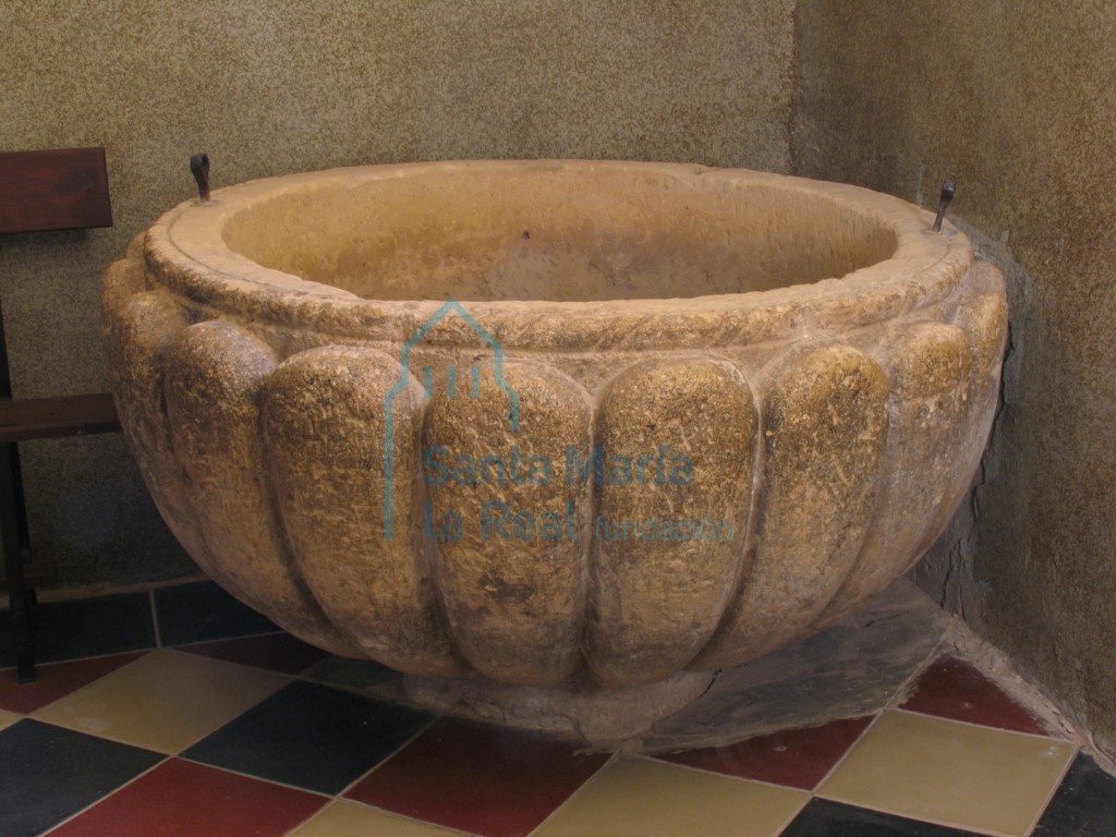 LA IGLESIA, dedicada a San Nicolás de Bari, está ubicada en el centro del núcleo urbano, en un entorno de espacios libres. Es un pequeño templo de carácter rural estructurado mediante una sencilla nave rematada por un ábside semicircular, con estancias adosadas en los laterales: al norte una torre y al sur la sacristía junto con una larga estancia rectangular que se ha tabicado para albergar diferentes dependencias tales como un pequeño portal que resguarda la entrada a la iglesia e incluso otra habitación habilitada como consultorio de atención primaria de la Junta de Castilla y León. Visibles en el muro septentrional de la nave y en el muro occidental de la torre son las rozas correspondientes a otra estancia de planta rectangular que la iglesia tuvo aquí adosada y cuya función desconocemos. Exteriormente podemos dividir el ábside en tres tramos diferenciados no sólo por la imposta achaflanada que los separa sino también por los diferentes materiales constructivos que se emplean en cada uno de ellos. Los dos primeros cuerpos son muy similares empleándose una mampostería de gran tamaño, mal concertada a pesar de utilizar gran cantidad de argamasa. En el tercer piso cambia el material pétreo usándose sillería caliza en la parte inferior y rematándose la parte superior con mampostería de menor tamaño que la anterior mezclada con ladrillos. Aunque bastante deteriorados se conservan fragmentos de la cornisa que remataba el ábside decorados con estrellas de cuatro puntas inscritas en círculos. Como testimonio del completo ábside románico que tuvo que tener la iglesia, en la parte norte de la cabecera se encuentran los restos de una imposta de nacela junto con un fuste de columna, un capitel y el arranque de un arco de lo que tuvo que ser una de las ventanas del ábside. En los restos del capitel que se conserva es posible vislumbrar la presencia de dos cuadrúpedos levantados sobre sus cuartos traseros. Tras analizar los restos y la situación de este ventanal no es descabellado suponer la existencia de otros dos vanos en la parte central y en el lateral sur del ábside siguiendo un esquema de colocación de ventanas empleado en numerosas iglesias románicas. Pero quizás el elemento distintivo de esta iglesia sea su poderosa torre, adosada en el lado norte a la altura del presbiterio, de planta cuadrangular, dividida en altura en dos pisos y construida con mampostería reforzada con sillares en las esquinas, materiales ocultos en parte por un enfoscado presente en los lados norte y este. Se conservan de época románica los restos de las primitivas troneras, dos en cada lateral, realizadas con sillería, que tendrían forma de arco de medio punto que apeaba en columnas de las que se conservan los fustes. Los esquinales de este cuerpo de la torre están achaflanados y tienen una columna adosada de la que también solamente pervive parte del fuste. Así pues con los escasos restos todavía visibles podemos suponer que, exteriormente, la torre de Escobar de Polendos tuvo un ordenamiento del muro externo similar a las torres de San Esteban o San Justo en Segovia y San Miguel en Sotosalbos. En el interior la torre se estructura en tres pisos, el primero de ellos cubierto con una bóveda de cañón colocada perpendicularmente al eje este-oeste de la iglesia y que surge de unas impostas de nacela. En este piso inferior en el lado oriental se abre un vano de formato rectangular ligeramente abocinado al interior realizado con sillares en los que se nota claramente la labra a hacha. Una precaria escalera de madera nos conduce hasta la entrada a la escalera original del edificio, empotrada en la hoja del muro occidental con acceso a través de un pequeño arco de medio punto en el piso inferior y una puerta de arco trilobulado en el ingreso al segundo piso, sobre la bóveda. Ubicar la escalera de la torre en la hoja del muro es un sistema desarrollado también en la torre de la iglesia de El Salvador en la capital. Este segundo cuerpo tiene una escalera ya moderna que comunica con las troneras de ladrillo. Curiosamente en ninguno de los pisos superiores se observan al interior restos de las troneras románicas, que tan claramente se muestran al exterior. En el interior de la iglesia, la nave permanece cubierta con bóveda de cañón con lunetos mientras que el presbiterio y el ábside se cubren con bóveda de medio cañón y de horno respectivamente adornadas ambas con yeserías barrocas. En la esquina suroccidental del templo se conserva una pila bautismal románica (123 cm de diámetro x 73 cm de altura) con una copa semiesférica sostenida por un pie de cemento y decorada con diecinueve gallones y un bocel sogueado bastante erosionado en la embocadura. La pieza románica más interesante y de mayor calidad que se encuentra en la iglesia es una pequeña pila aguabenditera (76 cm de altura x 31 cm de ancho). Pensada para ser colocada en un ángulo solamente tiene decorados dos de sus lados con tres pequeños fustes en cada uno de ellos coronados por cabecitas; en uno de los laterales las tres cabezas presentan el mismo rostro: ojos almendrados, narices rectas y pelo largo recogido hacia atrás tapando las orejas, mientras que en el otro lateral dos rostros masculinos con barba, bigote y pelo largo flanquean a una cabeza diferente al resto, de un tamaño ligeramente mayor también de pelo largo y tocada con una especie de corona, conservada sólo en parte, y cuya identificación es imposible. Creemos que la fisionomía y la talla de todos estos rostros puede relacionarse con las figuras del altar mayor de la iglesia de Santiago en Turégano, o con las cabecitas de la pila bautismal de Rebollo.
