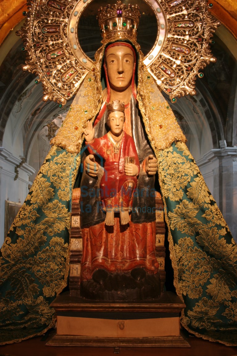 EL SANTUARIO BARROCO de la Virgen del Henar se encuentra situado a poco más de 5 km al noreste de Cuéllar y muy cercano a Viloria, ya perteneciente a la provincia de Valladolid. Según Martínez Díez ocupa el lugar en que se asentó el despoblado de Santa María del Henar, conocido gracias a la documentación fiscal de 1247, aldea en la que es posible se venerase la imagen. Actualmente preside el retablo mayor del templo sobre una peana giratoria de querubines, a la que se accede desde la zona posterior en la que se ubica un camarín del siglo XVIII. La leyenda cuenta que la figura fue traída a España desde Antioquía por San Geroteo, según la tradición, primer obispo de Segovia. Éste la depositó en un poblado cercano a Cuéllar donde permaneció hasta que sus fieles, aconsejados por San Frutos, decidieron enterrarla ante el temor de que fuera destruida por las huestes musulmanas. Tras desaparecer la población se perdió la memoria del lugar en que había sido ocultada, aunque no la de su existencia, transcurriendo así varias centurias. En torno a 1580 sería cuando una mujer reveló su situación a un joven pastor, que tras volver al lugar con su padre halló la imagen que fue imposible trasladar, lo que motivó la construcción del actual convento carmelita en aquel paraje. Se trata de una imagen lignaria, de pino, de 79 cm de alto por 31 cm de ancho y 19 cm de profundo que responde al repetido modelo medieval de Sedes sapientiae, que se reproducirá en tierras segovianas hasta bien entrado el siglo XIV. En él se muestra la figura de la Virgen actuando como trono de su hijo, quien sin relación alguna con la madre se sienta en su regazo en actitud de bendecir con la diestra. A la Virgen se le ha superpuesto corona de plata en la que aparece la figura de Cristo junto a los doce apóstoles y rico manto en época moderna. Se sienta sobre un sitial de brazos moldurados, en actitud hierática, con los brazos en ángulo recto y dirigidos paralelamente hacia el espectador, reconociéndose en ella el tipo iconográfico en el que María no toca al Niño sino que con su postura se convierte en Trono de Dios. Se repite así el ejemplo, entre otros, de Nuestra Señora del Val en Valladolid o de la enigmática “Virgen con el Niño” que se encuentra depositada en el museo de la misma capital, en cuya Guía se advierte que “procede de Cuéllar, donde se conservaba en una hornacina que coronaba una de las puertas de la muralla” como se apuntó en el tomo correspondiente de esta misma obra. Está tocada con corona real de madera, hoy oculta, que se dispone sobre un velo repintado, al igual que toda la pieza, en tono amarillento con el reborde rojizo y que llega a medio torso. Viste túnica bermeja hasta los pies de abultados y rectos plegados que comportan gran sensación de estatismo al conjunto. Sobre ella manto azulado que alcanza las rodillas, que quedan realzadas mediante someros pliegues circulares y diagonales realzando el volumen. Bajo la túnica asoman los pies, separados como es usual y calzados con chapines negros. Las manos le han sido restituidas, como puede apreciarse en antiguas fotos, datando las actuales del siglo XX, cuando fue restaurada por el artista Ángel García Ayuso siguiendo las pautas marcadas por el Marqués de Lozoya y don Luis Felipe Peñalosa. El Niño se asienta centrado sobre el regazo de la Madre. Su actitud es común en este tipo de representaciones: bendiciendo con la diestra y asiendo un libro con la izquierda. Igualmente luce corona real que repite el modelo de la que porta la madre. Viste túnica hasta los tobillos con ribete amarillo en la zona del cuello que repite los pliegues tubulares vistos con anterioridad, ceñida por un manto anudado a la cintura y que cae sobre el hombro izquierdo. Ambos rostros, de perfil ovalado, comparten el mismo tono ocre que el resto de zonas desnudas de los cuerpos. Los gestos, de evidente dulzura, junto a lo esbelto del conjunto denotan una cronología probablemente posterior a 1200 aun conservando plenamente resabios de raigambre románica.