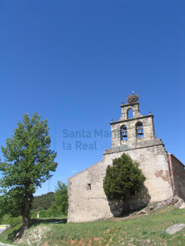 SE ENCUENTRA SITUADA esta pequeña iglesia al borde de la carretera nacional 110, sobre un altozano a la entrada del pueblo, separada unos 100 m de las primeras casas del mismo. Exteriormente es una sencilla fábrica de ábside semicircular, presbiterio y nave, teniendo un atrio adosado en su parte norte y una espadaña sobre el muro occidental. La cabecera -sobre todo el ábside- parece tener reminiscencias románicas en cuanto a su forma y volúmenes, pero el aspecto general del exterior del templo ha sido considerablemente modificado desde su fábrica románica original. El material empleado en la construcción es la mampostería reforzada con sillares en las esquinas aunque gran parte queda oculto por el esgrafiado que cubre el ábside y el tramo presbiterial sur, y por el enfoscado blanquecino del resto del edificio. El acceso al templo se realiza por el lado norte a través de una puerta de arco de medio punto con grandes dovelas que nos permite acceder al atrio. En dicho atrio, además de tabicarse para habilitar una sacristía y encontrarse en él la pila bautismal, se halla la portada original románica del templo que da paso al interior. Dicha puerta presenta un esquema bastante sencillo de arco de medio punto y arquivolta lisa que apoyan directamente sobre jambas prismáticas, coronadas por una línea de imposta de nacela. Todo el conjunto se protege por una chambrana con forma de bocel y borde exterior fileteado. Junto a la portada se colocó un aguamanil que lleva una inscripción fechándolo en 1732. El interior del edificio es muy simple cubriéndose la nave con armadura de madera y la cabecera con cielo raso, aunque es probable que tanto el ábside como el presbiterio estuviesen abovedados originalmente. Destaca solamente el arco triunfal que separa la nave de la cabecera, de factura muy similar al de la cercana ermita de la Virgen de la Varga, tiene forma de medio punto doblado apoyando sobre cimacios de nacela y éstos a su vez en columnas monolíticas sobre altos plintos coronadas por capiteles: en el capitel del lado del evangelio en una de las esquinas se representa una especie de mascarón o monstruo con las fauces abiertas mientras que en el capitel del lado de la epístola es imposible adivinar el tema representado a causa de su avanzado estado de deterioro.