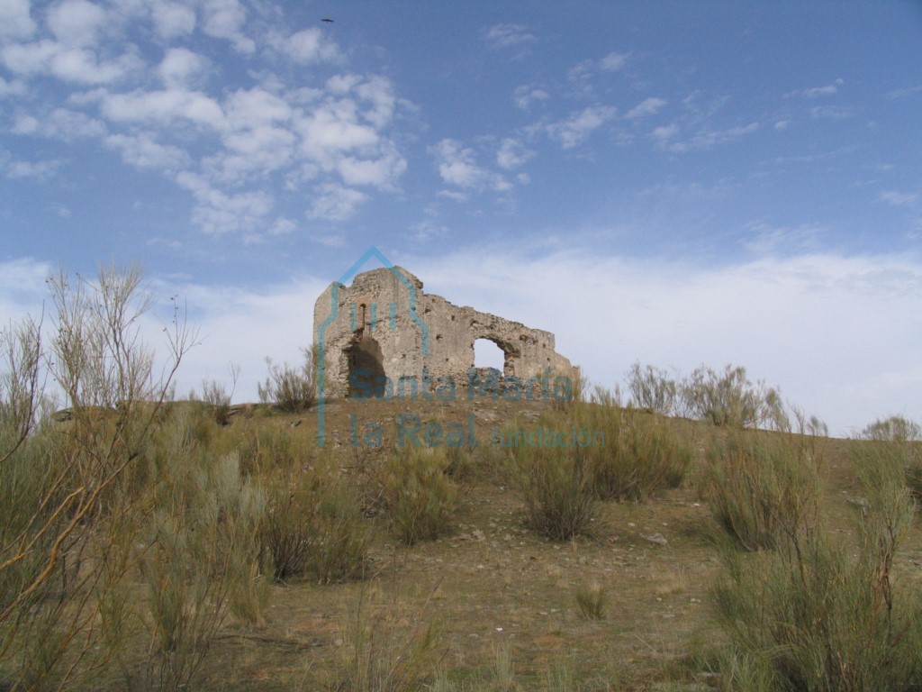 APROXIMADAMENTE A UN KILÓMETRO a la salida de Domingo García en dirección a Ortigosa de Pestaño, encontramos la ermita de San Isidro ubicada sobre un alto cerro de 986 metros de altitud desde el cual se tiene una hermosa panorámica de la comarca segoviana de Nieva. En las proximidades del cerro, como ya hemos apuntado, existen unas rocas en las que se pueden observar grabados paleolíticos y repiqueteados de época medieval, lo cual resulta indicativo de la antigüedad del poblamiento del lugar. El edificio primitivo tenía planta basilical, una nave, presbiterio y ábside semicircular. Estaba construido con mampostería de lajas de pizarra enfoscada, material muy abundante en la zona mientas que el ladrillo es muy posible que se utilizara como refuerzo de los ángulos, portadas y vanos aunque actualmente está prácticamente perdido en su totalidad. Tenía dos portadas situadas en el muro occidental y meridional pero hoy día solamente existen dos grandes boquetes en el lugar en el que iban colocadas. La ventana que existía en el ábside ha sido también destruida y tan sólo conservamos, sobre lo que debió ser la portada occidental, una ventana de arco de medio punto doblado de ladrillo con derrame interno y que se sostiene en pie de forma milagrosa. Con toda seguridad, el templo tuvo un atrio adosado en el lado sur del que hoy día tan sólo vemos los cimientos y que muy probablemente estaba construido con el mismo material que el resto del edificio.