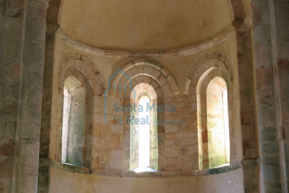 EL ÚNICO EDIFICIO QUE SOBREVIVE de todo el complejo es la iglesia monacal, que se adscribe al románico tardío y sigue las normas estilísticas de la reforma del Cister, que aconsejaba el mínimo de ornamentación en sus construcciones. Han desaparecido, sin embargo, el resto de las dependencias monásticas, que sólo una completa y cuidadosa excavación arqueológica podría replantear. Pero en todo caso puede creerse, con P. García Cuetos, que Bedón no llegase a contar con los recintos comunitarios característicos de los cenobios benedictinos. A tenor de su modestia y de la falta de restos localizados podría creerse más bien que contó únicamente con una especie de patio comunitario muy simple, rodeado de edificios y cerrado mediante muros, en forma parecida a como hoy se presenta. En efecto, la naturaleza cenagosa del terreno al Norte y al Este y las características arquitectónicas de su flanco meridional, que cuenta con una portada monumental y varias ventanas, permiten descartar la posibilidad de que hubiese algún tipo de dependencia en estos flancos. Por eso esta autora considera que, aunque infrecuente, la disposición más adecuada sería la organización del conjunto en torno a un patio abierto ante el imafronte de la iglesia, al modo que se encuentra en el monasterio de Santa María de Mave (Palencia). De todos modos nada podremos saber hasta que una excavación detallada aclare la cuestión, y a nuestro entender puede considerarse también la posibilidad de que la total desaparición de sus dependencias monasteriales puede atribuirse al posible empleo de materiales perecederos, que dejan un rastro mucho menos perceptible que las construcciones en piedra, y que sin embargo pudieron haber cumplido a la perfección las funciones propias de este tipo de estancias. La planta, orientada canónicamente al Este, mantiene la tipología frecuente de las iglesias monasteriales románicas, tanto benedictinas como reformadas bajo la orden cisterciense; en el área del oriente asturiano aparece también en las iglesias monasteriales de San Pedro de Villanueva (Cangas de Onís) y Santa María de Tina (Ribadedeva), pero la mejor conservación de la de Bedón permite también definirla como la más compleja de todas ellas. Consta de tres naves, (la central ligeramente más ancha) de dos tramos cada una (más desarrollado el segundo). Estas naves se corresponden con tres ábsides semicirculares que, al contrario que en los ejemplos citados, no se comunican mediante arcos interabsidales; el central está precedido de un tramo recto y destacado en planta, anchura y profundidad. Entre las naves y el ábside se dispone el crucero, no sobresaliente en planta, dividido en tres tramos; de ellos, el central tiene forma cuadrada, y los laterales adoptan una disposición rectangular. Por lo que se refiere a los accesos, se conservan actualmente tres. Dos de ellos son románicos monumentales, abiertos al Sur y Oeste, mientras que el tercero, secundario, es de traza algo posterior y cala el lienzo norte en la zona cercana a los pies, donde se adosaron en época moderna varias estancias de función desconocida. Respecto a la jerarquía de volúmenes que el edificio muestra al exterior, destacan la nave central (cubierta con tejado a dos aguas como los tramos laterales del crucero) sobre las naves laterales (cubiertas a un agua); por encima del resto del edificio, si bien no alcanza demasiada altura, sobresale la torre-cimborrio del tramo central del crucero. Por último, el ábside central destaca en alzado sobre los laterales, cubriendo los tres con tejado de medio cono. Por lo que respecta a los materiales empleados en la construcción del templo, debemos señalar la existencia de una cierta variedad que comprende la arenisca blanquecina de la mayor parte de la fábrica, la arenisca de tono rosáceo de la zona Suroeste de la iglesia, en la que se advierten los retoques del paramento de Menéndez Pidal, el esquisto gris presente en la portada Norte, y los cantos rodados del muro del ábside lateral Sur, que son los que mejor revelan el lógico aprovechamiento de los materiales propios de su ubicación natural. En cuanto al tipo de paramento, la mampostería y el sillarejo dominan en los muros de cerramiento, y contrastan con los sillares que se emplean en las partes más nobles: el recercado de vanos, esquinas, aleros y contrafuertes, así como de los dos cuerpos salientes en los que se integran las portadas occidental y meridional. Líneas de imposta en nacela articulan los muros exteriores de las naves, crucero y cabecera, disponiéndose sobre ellas las ventanas. Esa línea de imposta sólo se interrumpe en la esquina norte del ábside lateral sur; a continuación se inserta en línea con ella una pieza reaprovechada, de estructura alargada y decorada con nido de abeja, cuya ubicación primitiva desconocemos, ya que ninguna parte del exterior o interior de la iglesia muestra este motivo ornamental, muy frecuente, por otra parte, en los templos tardorrománicos de la zona, como San Pedro de Villanueva y Santa María de Villaverde. Los aleros de las naves, crucero y cabecera se recorren por una cornisa en nacela que cobija canecillos en caveto lisos, la mayor parte de ellos con la hipotenusa resaltada. La única variante la presentan los tejaroces de las portadas occidental y meridional, que ofrecen un mayor cuidado de ejecución, plasmado en las cornisas molduradas por varios bocelillos estrechos y en los canecillos esculpidos con variados motivos antropomórficos, zoomórficos y vegetales. La articulación vertical y refuerzo exterior de los muros se soluciona mediante contrafuertes de sillares dispuestos a modo de bandas de perfil escalonado, de grosor decreciente de abajo a arriba. Se distribuyen en las zonas de la fábrica que se corresponden al interior con cubiertas abovedadas, excepto los dos que recorren el imafronte, flanqueando la portada, donde se alzan hasta el punto más alto del t