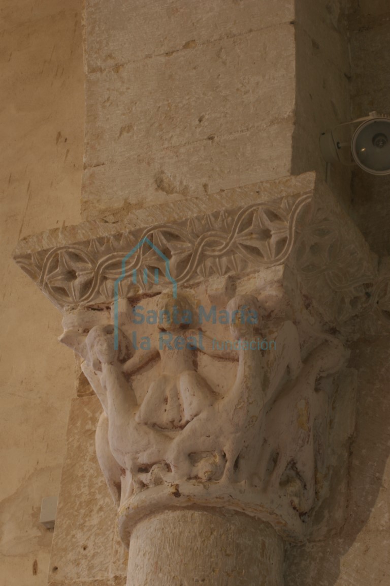 LA PARROQUIA DE LA CUESTA domina por el norte el caserío desde lo alto de la loma sobre la que se asienta la localidad y que le da nombre, constituyendo un magnífico mirador de todo el alto Pirón. A la inversa, tanto desde la carretera que faldea la Sierra en dirección a Soria como desde las ruinas de Santa María de la Sierra o la carretera que conduce a Cubillo, se contempla la iglesia majestuosa y emergente de su entorno. El templo, de planta basilical, presenta tras su ampliación a principios del siglo XVI tres naves, cerradas las colaterales a un agua y la central con artesa, comunicándose entre sí mediante dos parejas de amplios formeros, apuntados y moldurados con boceles y mediascañas los que dan a la nave del evangelio y de medio punto y achaflanados los de la sur, apeando los primeros en un pilar cúbico y los otros en uno de sección octogonal. Tal diversidad nos hace pensar que la ampliación de la nave tuvo lugar en dos momentos sucesivos, probablemente en el siglo XV la norte y a principios del XVI la meridional. También tardogótica es la capilla añadida al sur de la cabecera, rematando la nave de la epístola, de planta cuadrada y cubierta por bóveda de crucería con terceletes y ligaduras, claves con cresterías y sobre ménsulas decoradas con bolas. Preside el retablillo barroco de su testero, datado en 1709, un magnífico Crucificado gótico. Finalizan los añadidos a la fábrica original con el de un husillo que alberga una escalera de caracol para dar acceso al primer piso de la torre, adosado a su cara oriental. El conjunto, tanto la obra románica como los añadidos, se levantó en mampostería, reservándose el sillar para los esquinales, encintado de vanos y portadas. Pese a la diversidad de campañas, estas trasformaciones respetaron la cabecera original y en lo fundamental las dos fachadas laterales de la obra románica, trasladando aleros y portadas a su nueva ubicación. La cabecera, alzada sobre banco de sillería de aristas matadas por bocel, se compone de presbiterio con sus paramentos laterales animados por dobles arquerías lisas de medio punto, sobre las que corre la imposta de tetrapétalas en clípeos encima de la que voltea la bóveda de cañón que cubre el tramo. Dicha imposta se sigue en el hemiciclo, éste cerrado con bóveda de horno y que alberga un magnífico retablo que en su piso inferior reutiliza tablas góticas de otro anterior, con un fragmentario apostolado. Da paso a la cabecera un arco triunfal de medio punto y doblado, que apea en machones con una pareja de columnas entregas, sobre zócalos, plintos y basas áticas de grueso toro inferior aplastado. Las rematan bellos capiteles, el del lado del evangelio, bajo cimacio de rosetas, se decora con dos parejas de arpías de largos cuellos afrontadas, mientras un personaje con túnica corta cabalga sobre los lomos de las centrales, a las que ase por el cuello; el del lado de la epístola recibe acantos rematados por prominentes volutas y piso superior de caulículos, bajo cimacio de tallos entrelazados y espinosas palmetas pectiformes. Al exterior, el ábside muestra su mampostería revocada con cemento moderno imitando el despiece de sillares, con su hoy cegada ventana de saetera rodeada por arco de medio punto sobre impostas de nacela. Lo corona una cornisa que repite las flores de cuatro pétalos en clípeos vistas en el interior, sostenida por canes con lobuladas hojas picudas, prótomos de cérvidos y bóvidos, estilizados grifos rampantes y, junto al codillo septentrional, un curioso asno tocando la lira -repetido quizás en otra pieza muy desgastada del mismo hemiciclo- y una cigüeña. Aunque la adición de la capilla gótica torna difícil la visión de los canes del muro sur del presbiterio, reconocemos en ellos un descabezado león recostado, un acróbata y una acuclillada parturienta únicamente ataviada con velo y toca, como los anteriores, de buena factura. La fachada meridional, rodeada por el camposanto, muestra su hoy cegada portada abierta en un antecuerpo de sillería, con recubierto arco de medio punto y dos arquivoltas, la interior moldurada con tres cuartos de bocel en esquina retraído y la otra lisa, rodeada por chambrana de triple hilera de finos billetes. Apean los arcos en jambas escalonadas en las que se acodilla una pareja de columnas de semienterradas basas áticas y capiteles animalísticos. En el izquierdo del espectador vemos una pareja de leones afrontados y encorvados, mientras que en el otro -de perdido fuste- se afrontan dos parejas de estilizados grifos rampantes enredados en tallos, que con sus cuerpos dibujan formas acorazonadas, según modelo recurrente en el románico del Pirón y entorno de la capital. Los cimacios, que se ornan con tallos entrelazados, dibujando formas geométricas en el segundo caso, se continúan por el antecuerpo como imposta de palmetas pectiformes en tallos del tipo visto en el cimacio del capitel sur del triunfal. La reaprovechada cornisa repite las tetrapétalas caladas en clípeos, sobre una interesante serie de canecillos por desgracia de maltrecho relieve y diferentes calidades de talla. Además de algunos vegetales, entrelazos y prótomos de bóvidos, vemos en ellos, junto a músicos y acróbatas, y una serie de bustos humanos en diferentes actitudes de difícil interpretación, entre ellos un rústico con caperuza, otros frontales, uno realizando una mueca con la boca, a su lado una figura con el gesto de desesperación de asirse la muñeca derecha, cuya mano se lleva a la garganta, otro personaje mostrando un libro abierto, un híbrido de cuerpo de ave y cabeza felina que muerde su cola de reptil, una figura blandiendo un garrote, un lector, aves, esfinges, un grifo, un arquero disparando una flecha, una liebre y una máscara monstruosa de larga barba partida y aire demoníaco. También en la fachada septentrional se trasladó parte del alero y la portada, que repite fielmente el esquema de la antes descri
