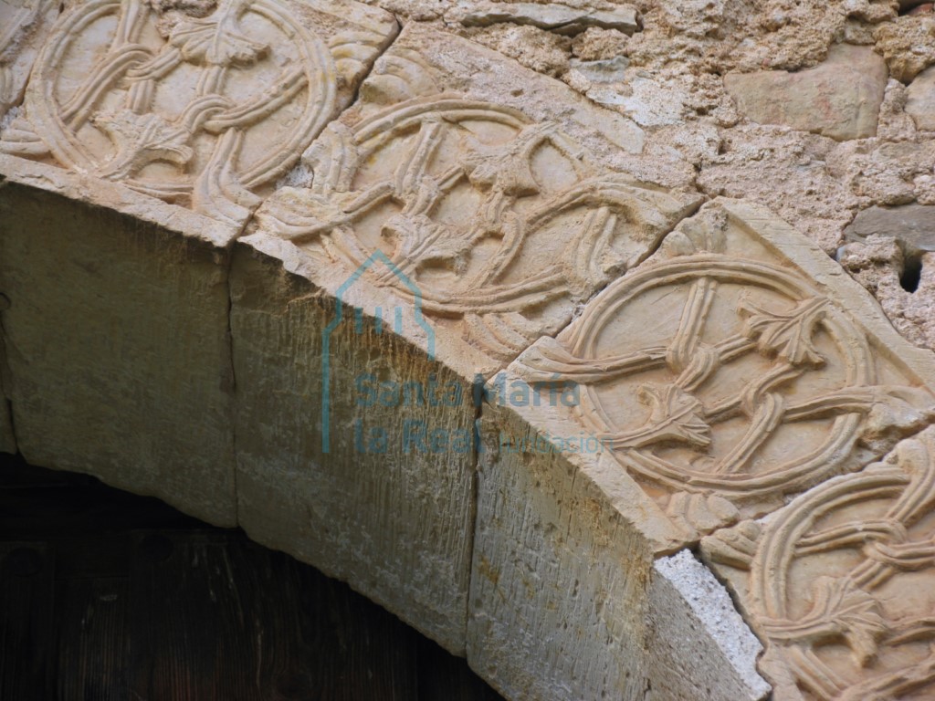 LA IGLESIA SE ENCUENTRA UBICADA unos 200 m alejada del caserío en la parte izquierda de la carretera que conduce hacia Pedraza. Rodeada de un pequeño murete con cruces de calvario fechadas a finales del siglo XVIII, la iglesia presenta una estructura que en algún momento pudo ser románica, aunque el paso del tiempo y las diferentes obras han modificado sustancialmente su primitivo aspecto. Lo que podemos ver en la actualidad es un templo construido en su mayor parte con mampostería salvo los sillares que se emplean en la esquinas, cabecera semicircular de gran altura, una sola nave, con torre adosada en el lado norte y una larga estancia rectangular ubicada en el lado sur que se compartimenta en otras cuatro para albergar una sacristía, una pequeña capilla dedicada a la Virgen del Carmen, el portal de entrada al templo y el baptisterio. Como ya hemos señalado anteriormente la cabecera de la iglesia se construye de mampostería, con un ábside completamente liso sin ventanas y con una cornisa moderna de perfil de gola o cima recta rodeando todo el perímetro de la cabecera. La nave fue reconstruida, aumentando considerablemente su altura, durante la segunda mitad del siglo XIX, en 1865, como reza una placa colocada en la parte superior del muro de la nave. Hoy día, todavía es visible parte de la esquina nororiental del muro de la primitiva fábrica por lo que podemos conocer su altura original y saber que la nave se ha sobreelevado. La torre adosada en el lado norte se construye al igual que el resto del edificio con mampostería y sillares en las esquinas a excepción del último cuerpo en el que se abren las troneras, reconstruido no hace mucho empleando para ello el ladrillo. Existen dos puertas de acceso al templo: en primer lugar la ubicada en la fachada occidental es una portada barroca construida en piedra y presidida por la tiara papal y las llaves, atributo de San Pedro. Una pequeña imagen tallada en piedra blanca del santo titular se coloca en la hornacina central. La otra portada se ubica en el lado meridional, remontada y colocada en esa larga estancia que se añadió a la nave de la iglesia. Cuenta con un arco de medio punto decorado con clípeos formados por tallos anudados cuyo interior se rellena con otros tallos también unidos formando motivos geométricos, rombos y triángulos. Un motivo decorativo de similares características encontramos en la portada conservada en el muro meridional de la iglesia de Nuestra Señora del Carrascal de Pedraza. Apoya el arco en sencillas jambas prismáticas con unas piezas actuando como cimacios en las que se talla un grueso tallo vegetal que se va entrelazando formando circunferencias. Embutidas en el muro, y cercanas a la puerta de acceso encontra mos varias piezas románicas como sillares labrados a hacha, bocel y sobre todo varias dovelas repartidas por la pared. En ellas se tallan por ejemplo un ave apoyada en una rama picoteando un fruto en forma de piña, dos cuadrúpedos uno de ellos erguido completamente sobre sus cuartos traseros mientras el otro apoya sus patas delanteras en una rama, dos cigüeñas una de ellas lleva una serpiente atrapada en su pico y la otra rodeada por una serpiente enredada en sus patas y una última dovela muy llamativa en la que se representa una figura masculina, subida a horcajadas sobre un cuadrúpedo, que sostiene con ambas manos un pesado mazo con el que parece a punto de golpear al animal. Se trata de la representación de la matanza del cerdo, una escena muy característica de los calendarios medievales españoles identificada normalmente con el mes de Noviembre, aunque pensamos que en esta ocasión no tiene nada que ver con la representación del mes, sino que sería un motivo más dentro del repertorio iconográfico que manejaban los maestros escultores de la época. El interior del edificio es muy sencillo, con la nave y la cabecera cubiertas con una falsa bóveda con decoración de yeserías imitando el estilo barroco, fechada en 1892, y que se encuentra en un estado cuando menos preocupante al tener algunas grietas y goteras que, si no se reparan, acabarán afectando a la totalidad de la bóveda. En la estancia del baptisterio ubicada en el ángulo suroccidental de la iglesia encontramos la pila bautismal románica (131 cm x 103 cm x 46 cm) de copa semiesférica decorada con 27 gallones sobre los cuales se talla una cenefa vegetal compuesta por pequeños tallos que se unen formando círculos dentro de los cuales se disponen pequeñas hojas. La embocadura interna es abocelada mientras que la externa lleva tallado un fino sogueado. El pie de la copa está decorado con franjas verticales dentro de las cuales se tallan parejas de hojas dispuestas horizontalmente. La unión entre el pie y la copa se adorna también con un grueso cordón. Encontramos otras pilas similares en cuanto a la morfología y ornamentación en iglesias segovianas, por ejemplo en la iglesia de San Juan en Pedraza, en la iglesia parroquial de Caballar o en la iglesia de Santiago en Turégano.