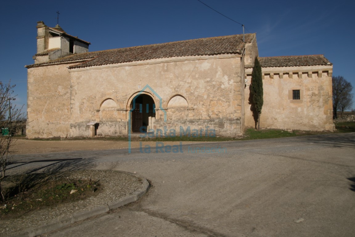 CONSTA ESTE MODESTO TEMPLO de nave única rematada por cabecera de testero plano, con galería porticada adosada a la fachada meridional, el conjunto levantado en mampostería con refuerzo de sillares en los encintados de vanos y esquinales. La nave, que se cubre con parhilera, fue prolongada hacia el oeste en un tercio de su longitud en época moderna, recibiendo en su hastial occidental una espadaña de remate apiñonado y dos tro neras de medio punto. Al norte de la cabecera se adosó además una sacristía, epigráficamente datada en 1771. La cabecera, que mantiene su estructura románica, muestra planta rectangular, dividiéndose en dos tramos mediante un fajón de medio punto que refuerza la bóveda de cañón que la cubre, sobre imposta de filete y probablemente rehecha. Apea dicho arco en una pareja de columnas entregas de sencillos capiteles de cestas troncopiramidales lisas, bajo cimacios de nacela, y basas de un toro con garras sobre plinto. Da paso a la cabecera un arco toral de medio punto doblado, apeado en fuertes machones con chaparras semicolumnas en sus frentes, sobre basas de gruesos toros. Se coronan éstas con muy rudos capiteles decorados con cuatro toscas cabecitas humanas bajo arquillos con alfiz; ambos son casi iguales, aunque en el del lado del evangelio, en la enjuta de la cara que mira a la nave se grabó una estrella de David y una “N”, así como una espiga en la columna. Al exterior, conserva la cabecera la cornisa abiselada sobre canes lisos, labrados a hacha. La parte románica de la nave, visible en su muro norte, muestra su fábrica de mampostería encofrada coronada por idéntico tipo de cornisa y canes que la cabecera. En el muro meridional se abre la portada, que al interior se manifiesta bajo un arco de descarga de medio punto labrado a hacha. Aunque de tipología claramente románica, aparece hoy torpemente remontada y consta de un deformado arco de medio punto rodeado por una arquivolta, ambos lisos, con tornapolvos ornado de puntas de diamante y biseles. Apean los arcos en jambas escalonadas rematadas por impostas de listel y nacela con cruces inscritas en clípeos. Ante la fachada meridional se dispuso un simple atrio porticado, levantado también en mampostería y coronado por cornisa de nacela. Conserva un hoy cegado acceso oriental, practicándose la entrada por el meridional, de arco de medio punto doblado. A ambos lados de éste se abren otros dos, correspondientes a la galería, igualmente de medio punto con impostas naceladas, sobre banco corrido con aristas de nacela. Faltan probablemente otros dos arcos a derecha e izquierda de la portada, aunque todo el aparejo del pórtico parece bastante removido y es posible que fuese remontado. En el interior, a los pies, bajo el coro de madera y junto al muro norte, se conserva la pila bautismal románica, de copa semiesférica de 127 cm de diámetro por 65 cm de altura, sobre basa de perfil ático con fino toro superior y toro inferior aplastado y moderno zócalo cilíndrico. La copa, labrada a hacha e interiormente avenerada, se decora con ocho gruesos gallones que alcanzan sin cesuras la embocadura. El carácter de los vestigios románicos, caracterizados por su rudeza y carácter popular, nos lleva a una cronología avanzada, probablemente ya dentro del siglo XIII.