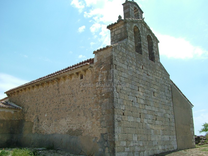 EL TEMPLO PARROQUIAL se sitúa en un pequeño altozano desde donde comienza la disposición del caserío hacia la vega. La planta original románica se encuentra oculta bajo una serie de edificios anexionados tanto al muro sur como al norte. En el primero se añaden una pequeña capilla, un pórtico de entrada y un cuarto trastero a los pies de la nave. En el segundo, y pegado al ábside, se dispone la sacristía en la que se guardan los objetos litúrgicos usados en la misa. Teniendo en cuenta estos aditivos, la planta conservada es la románica de origen, de una sola nave, ábside en hemiciclo y acceso en el muro sur. Los materiales utilizados en su construcción son de mampostería, rematada en sillares labrados como refuerzo en sus esquinales. La espadaña se construye totalmente en sillar lo que nos apuntaría una construcción posterior a la época románica. Probablemente la altura de la iglesia no sea la original, pues los muros y los canecillos parecen haber sufrido modificaciones. Estos últimos se disponen sustentando la cornisa de los muros norte y sobre el cuerpo circular de la cabecera. Los canecillos son lisos, de tipo cóncavo, sin decoración alguna. El acceso al interior se dispone en el muro sur bajo un pequeño pórtico de factura moderna. La portada en sí se resuelve con tres arquivoltas abocinadas y chambrana de decoración de taqueado jaqués. La arquivolta interior se encuentra adovelada con decoración de arista viva. Las dos siguientes se molduran en aristas y boceles combinados en su parte exterior. Todo el conjunto se sustenta sobre un grueso ábaco y pilastras también en ligera degradación hacia el interior. Interiormente la iglesia conserva su disposición en nave única con coro de madera elevado a los pies y presbiterio semicircular separado de la nave por arco triunfal. El arco que vemos hoy es obra del siglo XVI sustituyendo al anterior románico apoyado sobre pilastras. Su ábaco es el principio de la línea de imposta que recorrerá todo el perímetro del presbiterio. Una bóveda de cañón enyesada cubre el tramo recto, mientras que para el hemiciclo se utiliza bóveda de horno. Bajo la línea de imposta se dispone en el centro del ábside una ventana saetera en derrame que daría iluminación al espacio sagrado. Por su morfología constructiva, por los elementos originales que han llegado hasta nosotros y teniendo en cuenta los aspectos históricos ya comentados podemos aventurar una cronología del templo cercana a fines del siglo XII. En la capilla aneja al muro sur se localiza la pila bautismal románica del templo. Sobre una basa estriada de aproximadamente 30 cm se dispone la copa semiesférica de 1 m de alto y 85 cm de diámetro. El brocal de la pila se resuelve en una pequeña moldura semicircular con incisión inferior que recorre todo el diámetro. La copa está decorada con gruesos gallones que están enmarcados en su parte superior por arcos de medio punto en relieve, esto crea un juego de volúmenes y de sombras muy destacable. Todos los gallones se enjarjan en la base de la copa. La decoración gallonada enmarcada por arcos es frecuente en el ámbito de Guadalajara, así la vemos en parroquias como Abánades, Romanones, Hontanares, Henche u Olmeda del Extremo.
