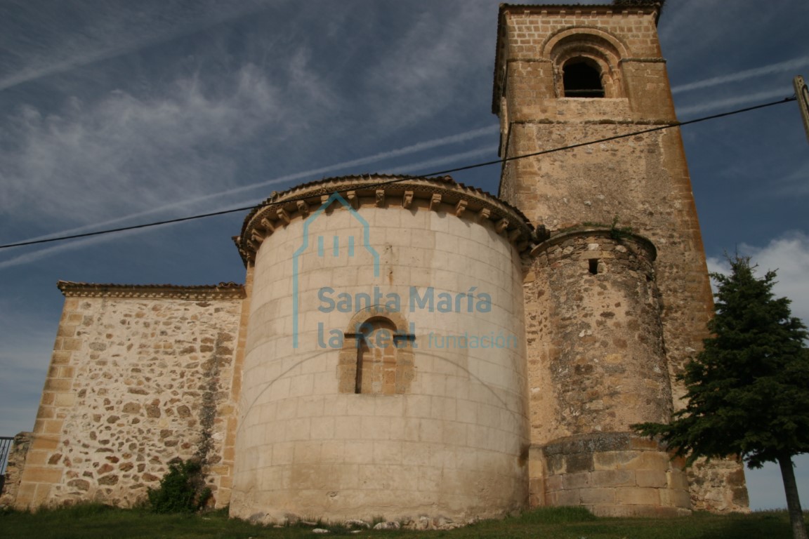 LA PARROQUIA DE LA CUESTA domina por el norte el caserío desde lo alto de la loma sobre la que se asienta la localidad y que le da nombre, constituyendo un magnífico mirador de todo el alto Pirón. A la inversa, tanto desde la carretera que faldea la Sierra en dirección a Soria como desde las ruinas de Santa María de la Sierra o la carretera que conduce a Cubillo, se contempla la iglesia majestuosa y emergente de su entorno. El templo, de planta basilical, presenta tras su ampliación a principios del siglo XVI tres naves, cerradas las colaterales a un agua y la central con artesa, comunicándose entre sí mediante dos parejas de amplios formeros, apuntados y moldurados con boceles y mediascañas los que dan a la nave del evangelio y de medio punto y achaflanados los de la sur, apeando los primeros en un pilar cúbico y los otros en uno de sección octogonal. Tal diversidad nos hace pensar que la ampliación de la nave tuvo lugar en dos momentos sucesivos, probablemente en el siglo XV la norte y a principios del XVI la meridional. También tardogótica es la capilla añadida al sur de la cabecera, rematando la nave de la epístola, de planta cuadrada y cubierta por bóveda de crucería con terceletes y ligaduras, claves con cresterías y sobre ménsulas decoradas con bolas. Preside el retablillo barroco de su testero, datado en 1709, un magnífico Crucificado gótico. Finalizan los añadidos a la fábrica original con el de un husillo que alberga una escalera de caracol para dar acceso al primer piso de la torre, adosado a su cara oriental. El conjunto, tanto la obra románica como los añadidos, se levantó en mampostería, reservándose el sillar para los esquinales, encintado de vanos y portadas. Pese a la diversidad de campañas, estas trasformaciones respetaron la cabecera original y en lo fundamental las dos fachadas laterales de la obra románica, trasladando aleros y portadas a su nueva ubicación. La cabecera, alzada sobre banco de sillería de aristas matadas por bocel, se compone de presbiterio con sus paramentos laterales animados por dobles arquerías lisas de medio punto, sobre las que corre la imposta de tetrapétalas en clípeos encima de la que voltea la bóveda de cañón que cubre el tramo. Dicha imposta se sigue en el hemiciclo, éste cerrado con bóveda de horno y que alberga un magnífico retablo que en su piso inferior reutiliza tablas góticas de otro anterior, con un fragmentario apostolado. Da paso a la cabecera un arco triunfal de medio punto y doblado, que apea en machones con una pareja de columnas entregas, sobre zócalos, plintos y basas áticas de grueso toro inferior aplastado. Las rematan bellos capiteles, el del lado del evangelio, bajo cimacio de rosetas, se decora con dos parejas de arpías de largos cuellos afrontadas, mientras un personaje con túnica corta cabalga sobre los lomos de las centrales, a las que ase por el cuello; el del lado de la epístola recibe acantos rematados por prominentes volutas y piso superior de caulículos, bajo cimacio de tallos entrelazados y espinosas palmetas pectiformes. Al exterior, el ábside muestra su mampostería revocada con cemento moderno imitando el despiece de sillares, con su hoy cegada ventana de saetera rodeada por arco de medio punto sobre impostas de nacela. Lo corona una cornisa que repite las flores de cuatro pétalos en clípeos vistas en el interior, sostenida por canes con lobuladas hojas picudas, prótomos de cérvidos y bóvidos, estilizados grifos rampantes y, junto al codillo septentrional, un curioso asno tocando la lira -repetido quizás en otra pieza muy desgastada del mismo hemiciclo- y una cigüeña. Aunque la adición de la capilla gótica torna difícil la visión de los canes del muro sur del presbiterio, reconocemos en ellos un descabezado león recostado, un acróbata y una acuclillada parturienta únicamente ataviada con velo y toca, como los anteriores, de buena factura. La fachada meridional, rodeada por el camposanto, muestra su hoy cegada portada abierta en un antecuerpo de sillería, con recubierto arco de medio punto y dos arquivoltas, la interior moldurada con tres cuartos de bocel en esquina retraído y la otra lisa, rodeada por chambrana de triple hilera de finos billetes. Apean los arcos en jambas escalonadas en las que se acodilla una pareja de columnas de semienterradas basas áticas y capiteles animalísticos. En el izquierdo del espectador vemos una pareja de leones afrontados y encorvados, mientras que en el otro -de perdido fuste- se afrontan dos parejas de estilizados grifos rampantes enredados en tallos, que con sus cuerpos dibujan formas acorazonadas, según modelo recurrente en el románico del Pirón y entorno de la capital. Los cimacios, que se ornan con tallos entrelazados, dibujando formas geométricas en el segundo caso, se continúan por el antecuerpo como imposta de palmetas pectiformes en tallos del tipo visto en el cimacio del capitel sur del triunfal. La reaprovechada cornisa repite las tetrapétalas caladas en clípeos, sobre una interesante serie de canecillos por desgracia de maltrecho relieve y diferentes calidades de talla. Además de algunos vegetales, entrelazos y prótomos de bóvidos, vemos en ellos, junto a músicos y acróbatas, y una serie de bustos humanos en diferentes actitudes de difícil interpretación, entre ellos un rústico con caperuza, otros frontales, uno realizando una mueca con la boca, a su lado una figura con el gesto de desesperación de asirse la muñeca derecha, cuya mano se lleva a la garganta, otro personaje mostrando un libro abierto, un híbrido de cuerpo de ave y cabeza felina que muerde su cola de reptil, una figura blandiendo un garrote, un lector, aves, esfinges, un grifo, un arquero disparando una flecha, una liebre y una máscara monstruosa de larga barba partida y aire demoníaco. También en la fachada septentrional se trasladó parte del alero y la portada, que repite fielmente el esquema de la antes descri