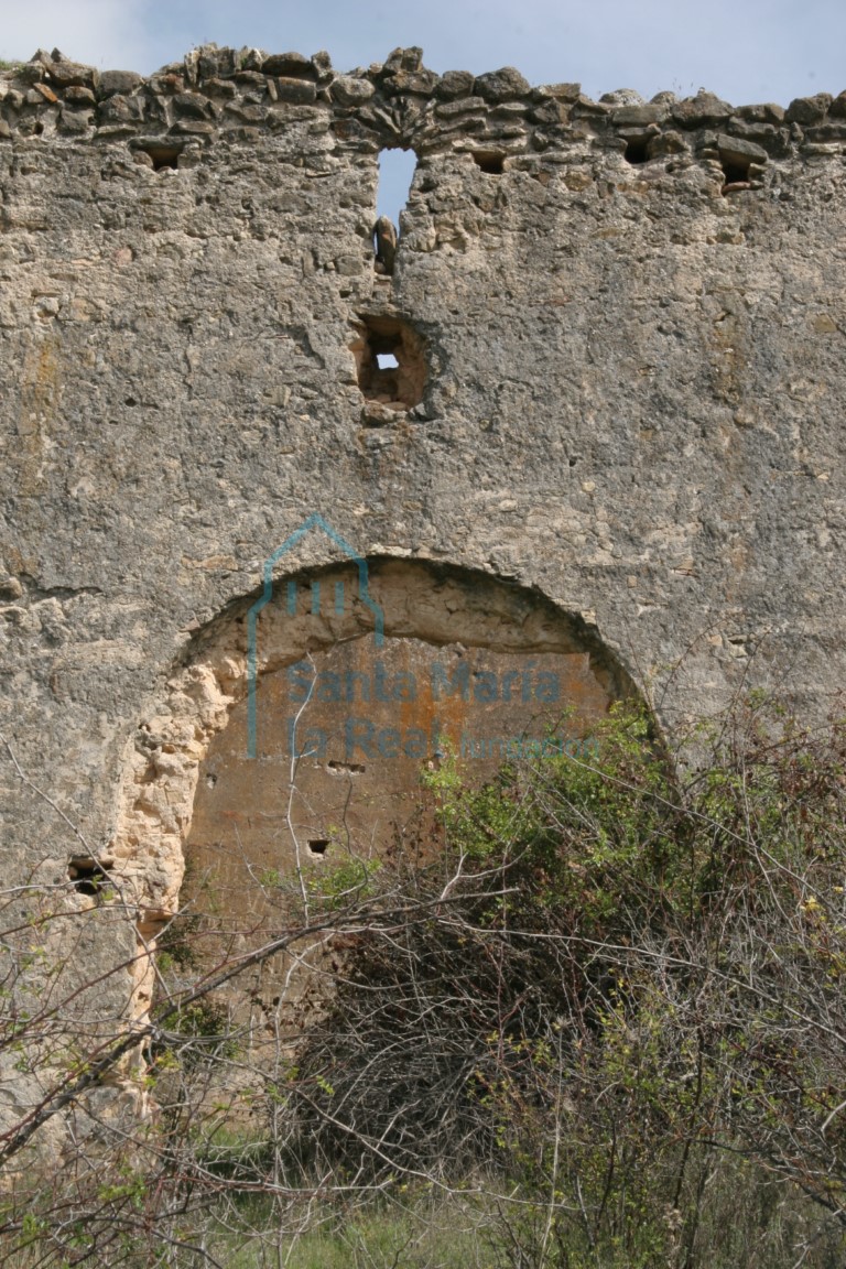 LAS RUINAS DE SAN PEDRO se alzan en la acusada ladera de un altozano al que bordea la carretera que une El Cubillo con Valdevacas, casi en la linde de ambos núcleos, a unos 800 m de la primera localidad y apenas a 500 m del centro de la segunda, a cuyo término pertenece. Sito en terreno de propiedad particular, el templo constituye el único vestigio de una antigua aldea o barrio del que nada sabemos. El abrupto entorno de la iglesia muestra acusadas pendientes por todos sus costados salvo el meridional, hacia donde se abre la portada, indicando así con toda probabilidad la disposición del desaparecido caserío. Es muy posible que éste quedase yermo en época remota, como parecen indicar tanto la total ausencia de vestigios -e incluso de un camino definido hasta el templo- como la carencia de sacristía en el edificio. Los restos del sencillo edificio, de planta basilical orientada y modestas proporciones, se levantan en encofrado de calicanto, conservándose relativamente bien la caja de muros de la nave. La portada se abría aproximadamente en el centro del muro meridional de ésta, que debía cerrarse con una parhilera, suposición a la que invita tanto el grosor de los muros -unos 75 cm- como la ausencia de contrafuertes. Peor suerte ha corrido la cabecera, cuyos muros manifiestan un regruesamiento de unos 10 cm respecto a los de la nave y a la que se accedía por un arco triunfal quizás recercado por una desaparecida sillería. A duras penas se mantienen los muros del presbiterio, en su día cerrado por bóveda de cañón realizada en calicanto, de la que restan los riñones del costado meridional. Partía esta bóveda de una imposta en piedra con perfil de nacela, de la que sólo resta un mínimo testigo empotrado en el machón que recogía el triunfal y la gran roza dejada en el encofrado por su expolio. Coronaba los muros del presbiterio una hilera de canecillos, de las que sólo nos resta un mutilado testigo junto al codillo del muro sur del presbiterio con la nave, suficiente al menos para evidenciar su típicamente románica labra a hacha. Del ábside, completamente arruinado, apenas si podemos constatar su planta semicircular y suponer que, según la norma, se cerraría con una bóveda de horno. El acceso se realizaba a través de un arco de medio punto y quizás una arquivolta, ambos en el espesor del muro y muy probablemente, como las jambas, realizados en una sillería hoy expoliada. Daban luz a la nave tres vanos, dos saeteras abiertas en los muros norte y sur -ésta sobre la portada- y otro más amplio, con arco de medio punto de aspecto remozado, en el hastial occidental. Se remata éste a piñón, viéndose flanqueado por dos profundas grietas que ciernen oscuros augurios sobre la conservación de las maltratadas ruinas.