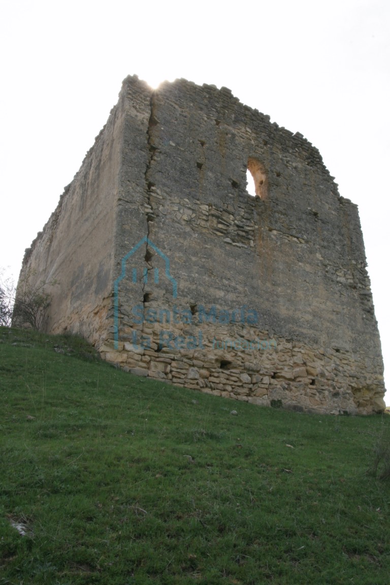 LAS RUINAS DE SAN PEDRO se alzan en la acusada ladera de un altozano al que bordea la carretera que une El Cubillo con Valdevacas, casi en la linde de ambos núcleos, a unos 800 m de la primera localidad y apenas a 500 m del centro de la segunda, a cuyo término pertenece. Sito en terreno de propiedad particular, el templo constituye el único vestigio de una antigua aldea o barrio del que nada sabemos. El abrupto entorno de la iglesia muestra acusadas pendientes por todos sus costados salvo el meridional, hacia donde se abre la portada, indicando así con toda probabilidad la disposición del desaparecido caserío. Es muy posible que éste quedase yermo en época remota, como parecen indicar tanto la total ausencia de vestigios -e incluso de un camino definido hasta el templo- como la carencia de sacristía en el edificio. Los restos del sencillo edificio, de planta basilical orientada y modestas proporciones, se levantan en encofrado de calicanto, conservándose relativamente bien la caja de muros de la nave. La portada se abría aproximadamente en el centro del muro meridional de ésta, que debía cerrarse con una parhilera, suposición a la que invita tanto el grosor de los muros -unos 75 cm- como la ausencia de contrafuertes. Peor suerte ha corrido la cabecera, cuyos muros manifiestan un regruesamiento de unos 10 cm respecto a los de la nave y a la que se accedía por un arco triunfal quizás recercado por una desaparecida sillería. A duras penas se mantienen los muros del presbiterio, en su día cerrado por bóveda de cañón realizada en calicanto, de la que restan los riñones del costado meridional. Partía esta bóveda de una imposta en piedra con perfil de nacela, de la que sólo resta un mínimo testigo empotrado en el machón que recogía el triunfal y la gran roza dejada en el encofrado por su expolio. Coronaba los muros del presbiterio una hilera de canecillos, de las que sólo nos resta un mutilado testigo junto al codillo del muro sur del presbiterio con la nave, suficiente al menos para evidenciar su típicamente románica labra a hacha. Del ábside, completamente arruinado, apenas si podemos constatar su planta semicircular y suponer que, según la norma, se cerraría con una bóveda de horno. El acceso se realizaba a través de un arco de medio punto y quizás una arquivolta, ambos en el espesor del muro y muy probablemente, como las jambas, realizados en una sillería hoy expoliada. Daban luz a la nave tres vanos, dos saeteras abiertas en los muros norte y sur -ésta sobre la portada- y otro más amplio, con arco de medio punto de aspecto remozado, en el hastial occidental. Se remata éste a piñón, viéndose flanqueado por dos profundas grietas que ciernen oscuros augurios sobre la conservación de las maltratadas ruinas.