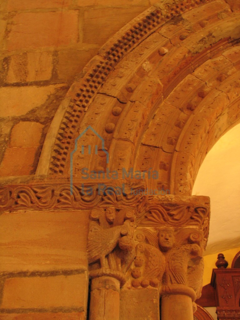 LA IGLESIA DE SANTIAGO DE ARLÓS es un pequeño edificio que puede ser fácilmente identificado como un ejemplo del llamado románico de tipo popular, cuya características estructurales mantiene a pesar de los añadidos de épocas posteriores, añadidos entre los que se encuentran dos capillas flanqueando el ábside, la espadaña (del siglo XVII) y un pórtico abierto en los lados sur y oeste que cobija la portada principal. En 1997 se efectuaron labores de restauración que suprimieron parte de dicho pórtico, para dejar al descubierto la portada. En origen, Santiago de Arlós habría sido un templo de nave única y ábside cuadrado; la cubierta, de madera a dos aguas para la nave y de bóveda de cañón para la cabecera. En el interior se conserva el arco triunfal, al que Vigil, en 1887, hacía una referencia por llamar “la atención de los aficionados a la arqueología por su elegancia y buena conservación”. Se trata de un arco triunfal articulado en dos arquivoltas de medio punto, protegidas por guardapolvo ajedrezado, y molduradas a base de boceles y medias cañas, dentro de las cuales se sitúan perlas (en el caso de la primera arquivolta) y puntas de diamante (en el caso de la segunda); además de ello, los boceles, tanto en el frente como en el intradós, se decoran con una sucesión de semicírculos concéntricos, que volveremos a encontrar en la portada occidental, lo cual otorga una fuerte sensación de homogeneidad a todo el conjunto decorativo. Ambas arquivoltas descansan sobre impostas decoradas a base de entrelazos y palmetas; las columnas, pareadas las del interior, rematan en capiteles de cuidada factura técnica, cuya ornamentación sobrepasa los límites del cuerpo del capitel y actúa a modo de friso continuo, sin llegar a serlo. En la jamba izquierda, el primer capitel muestra una pareja de gallos afrontados, símbolos del Cristo triunfante, picoteando un fruto; sobre ellos aparecen sendos rostros humanos, inexpresivos, flanqueados por volutas vegetales. El segundo capitel, muestra dos parejas de aves apicadas, en esta ocasión palomas, sosteniendo nuevamente un fruto; a uno de los lados de cada pareja aparece una nueva ave, en este caso sola, acompañada de más frutos; y sobre ellas, rostros masculinos entre volutas. En todos los casos destaca el tratamiento dado al plumaje, de líneas esquemáticas pero muy detallado. El tema de dos aves afrontadas era un motivo recurrente del arte románico, y se conocen numerosos ejemplos en edificios asturianos de la época, especialmente en las zonas costeras. Esta iconografía, surgida en la etapa paleocristiana, poseía un claro significado eucarístico (las almas de los hombres bebiendo de la fuente de la vida), aunque progresivamente la imagen iría reforzando su carácter decorativo en detrimento del significativo. Los capiteles de la jamba derecha, por su parte, se decoran con motivos vegetales de grandes hojas lanceoladas, rematadas, algunas de ellas, en frutos apomados; en la parte superior, asomando entre las hojas, aparecen varios rostros humanos y varias máscaras, entre monstruosas y caricaturescas. La portada occidental está conformada por dos arquivoltas de medio punto protegidas por un guardapolvo nuevamente decorado con ajedrezado. La primera arquivolta, es decir, la exterior, aparece finamente decorada con dos bandas de semicírculos concéntricos, similares a los del arco triunfal, que flanquean una moldura cóncava en la que se tallaron formas florales; los semicírculos concéntricos también se repiten en el intradós de esta arquivolta. La segunda arquivolta presenta una decoración similar, aunque sustituye las rosetas por pequeñas tetrapétalas de botón central, y los semicírculos por dientes de sierra de poco resalte; en el intradós, los dientes de sierra flanquean puntas de diamante. Ambas arquivoltas descansan sobre impostas ornamentadas con un doble motivo: dos finas líneas de sogueado en la parte superior, y un dibujo de lacería enmarcando flores en la parte inferior. A pesar de desarrollarse en dos arquivoltas, la portada de Arlós sólo presenta un capitel decorado a cada lado; la rosca interior apoya, tras la correspondiente imposta, directamente en la jamba, hecho que parece deberse a razones estéticas, pues las líneas de puntas de diamante y dientes de sierra que remata dicha arquivolta continuan a lo largo de las jambas, hasta llegar al nivel de la basa, otorgando a la portada un aspecto homogéneo. En cuanto a los capiteles, el del lado izquierdo representa una escena de cetrería, con la imagen de dos caballeros, sobre sus monturas, y con un halcón posado en sus brazos. El capitel del lado derecho, aunque más erosionado, permite distinguir dos grandes animales afrontados, sobre los que aparecen sendos rostros humanos entre volutas vegetales. Al exterior, el ábside conserva el alero decorado con canecillos tallados, así como un vano rematado en un arco de medio punto y guardapolvo ajedrezado, sostenido por dos finas columnas. La pequeña rosca repite la decoración de semicírculos concéntricos en los boceles y las puntas de diamante en la moldura cóncava, así como las crucetas inscritas en círculos, en ambas impostas. Los capiteles muestran parejas de animales afrontados: en el caso del capitel izquierdo, son dos cuerpos compartiendo una única cabeza de cordero que sostiene con sus patas delanteras un objeto, quizá un libro, siguiendo la iconografía cristológica del Cordero Apocalíptico. El capitel derecho de la ventana del ábside presenta dos felinos que también comparten una misma cabeza de aspecto monstruoso devorando un pequeño animal. La imagen de dos felinos afrontados puede tener varias lecturas simbólicas; la primera de ellas es la que se relaciona con el miedo que provocan estos animales, por lo que su ataque podría simbolizar, sencillamente, la muerte, tal como es frecuente encontrar entre sarcófagos paleocristianos; otras posibilidades son la luc