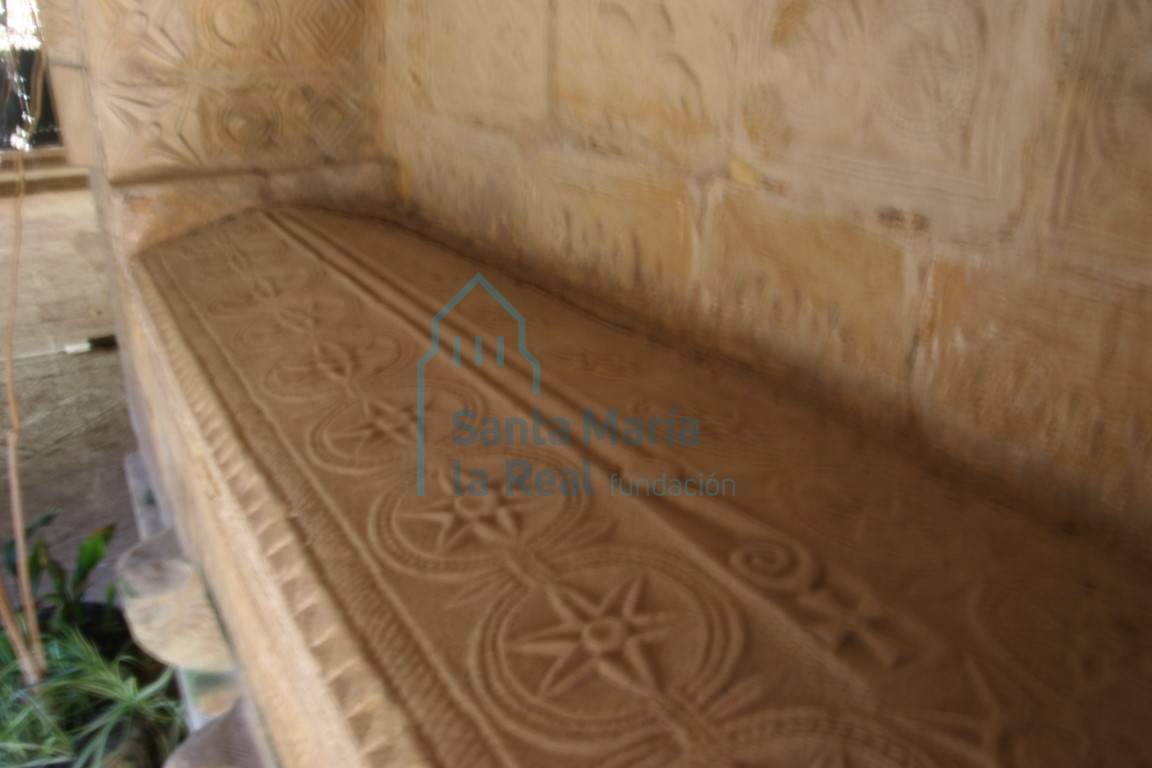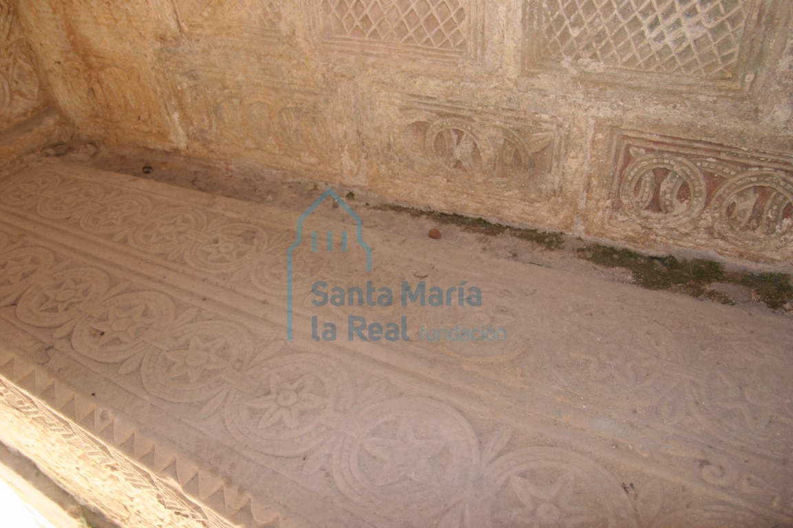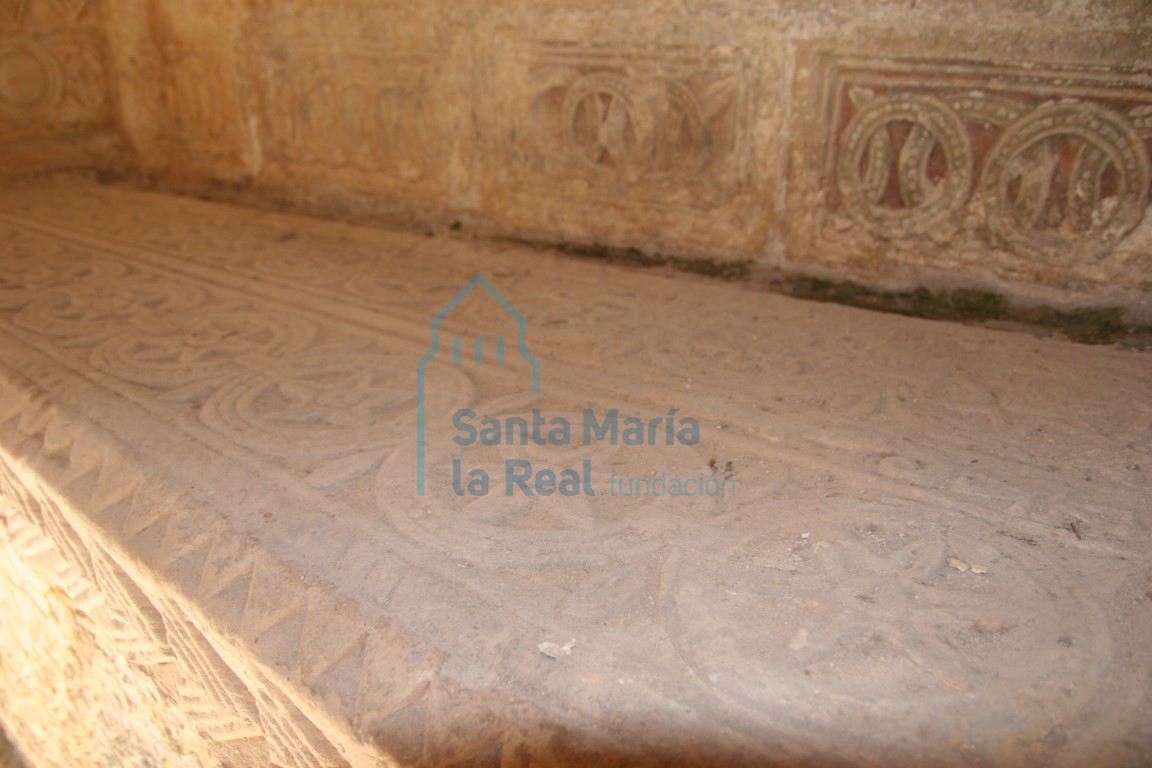 CASI NADA SE HA CONSERVADO de la fábrica medieval de la colegiata de Santa María de Covadonga. Las difíciles condiciones que ofrecía la roca de la cueva para cualquier mínima construcción hicieron que las descripciones más antiguas describan el templo como una iglesia de madera que se sujetaba con dificultad en la pared rocosa. De su entorno inmediato, sin embargo, se han conservado hasta nuestros días dos interesantes piezas que pueden dar buena cuenta de la notable calidad que el conjunto pudo haber tenido. Se trata de dos sepulcros románicos, empotrados en la crujía oeste del piso bajo del claustro de la Colegiata barroca, adosados a la roca y por tanto muy cercanos a la cueva. Estos se estructuran en dos arcosolios que cobijan laudas, construidos con piedra arenisca dorada (excepto las laudas, que parecen de piedra caliza) y rejunteados quizá en la restauración de la Colegiata que llevó a cabo Luis Menéndez Pidal en 1950. No podemos asegurar que su actual ubicación sea la originaria, ya que ignoramos si la construcción del claustro del siglo XVII se llevó a cabo sobre el medieval. En cuanto a su titularidad, ninguna inscripción o motivo ofrece información clara al respecto. El báculo que presentan las laudas de los dos enterramientos permite suponerlos depósito de los restos de algún abad, pero a mediados del siglo XIX los informantes del Diccionario de Pascual Madoz indicaban que en su época pertenecían a dos familias nobles de la zona: la de Cortés, de la villa de Cangas de Onís, y la de Noriega, de Onao. De esto puede concluirse únicamente que dichas familias pudieron haber sido el origen de alguno de los abades de Covadonga y que sus sepulcros permaneciesen bajo titularidad del linaje, pero a la vista de estos datos nada más puede afirmarse sobre esta cuestión. Los dos arcosolios muestran la misma estructura arquitectónica, consistente en un arco de medio punto que genera en profundidad una bóveda de cañón, decorada con relieves dispuestos a modo de casetones formando una retícula. La rosca del arco se protege por un guardapolvo y arranca de impostas monolíticas, en forma de prisma rectangular. Las paredes del fondo del nicho se aparejan con buenos sillares. Las laudas cobijadas bajo los arcosolios son monolíticas y presentan forma ligeramente trapezoidal. Bajo ellas se insertan en el muro frontalmente otras dos lápidas rectangulares, también monolíticas. La del arcosolio izquierdo apoya en tres piezas escultóricas de bulto redondo, a modo de ménsulas. Sin embargo, lo más interesante y llamativo de los enterramientos románicos de Covadonga son los relieves que los decoran tan profusamente, con la siguiente distribución. En el arcosolio izquierdo, el guardapolvo se recorre por una cenefa de dobles círculos perlados, entre los cuales se disponen dos pétalos afrontados; estos círculos se enlazan mediante eslabones igualmente perlados. La rosca del arco se decora con una sucesión de florones de seis pétalos estrellados con botón central. El intradós de la bóveda presenta tres hileras de dovelas, esculpidas de exterior a interior con los siguientes motivos: florones de cuatro pétalos estrellados y botón central, dobles círculos perlados de los que parten cuatro picos, y varios rombos concéntricos enfilados. Los dos sillares monolíticos de los que arranca la rosca, algo salientes con respecto al intradós de la bóveda, presentan el borde abocelado. En sus caras visibles se disponen estrellas inscritas en círculos. La lauda sepulcral que cobija este arcosolio divide su frente en dos espacios mediante un báculo abacial, que marca el eje longitudinal de la misma, y se remata por una cruz griega y un motivo floral. Ambas partes se decoran con hileras de dobles círculos entre los que se disponen pétalos afrontados, unidos por eslabones, en los que se inscriben estrellas. Enmarca la lauda una orla sogueada y dientes de sierra en el borde. En la cara lateral vista se dispone una sucesión de puntas de flecha. Por su parte, la lápida empotrada en el muro bajo el arcosolio se enmarca por dos incisiones sencillas y se divide en dos bandas longitudinales en las que se disponen hileras de dobles círculos enfilados, entre los que se sitúan pétalos separados por eslabones. Esta lauda se sostiene por tres esculturas de bulto redondo en las que se detallan ojos, orificios nasales y boca, y que representan toscamente las figuras leoninas que habitualmente sujetaban los sarcófagos románicos; en Asturias son muy escasos los ejemplos, pero pueden recordarse las figuras de león reutilizadas como dovelas en Cornellana (Salas) o las de un enterramiento de la iglesia parroquial de Vega de Poja (Siero) que, como en Covadonga, aparecen empotradas en el muro. En fin, el muro del fondo del nicho se apareja mediante cuatro hileras de sillares bien escuadrados, en los que se disponen los siguientes relieves de arriba a abajo y de izquierda a derecha: en la primera hilada, rombos concéntricos perlados enfilados flanqueando una cruz griega con gemas en los cuatro extremos de sus brazos (motivo que también aparecía en la lauda) junto a un rombo y una rama; en la segunda, dos pisos de puntas de flecha enfiladas dispuestas en diferentes sentidos; en la tercera, un singular relieve de un caballero dispuesto de perfil, ataviado con túnica y con el cabello largo y algo rizado; flanqueándolo, en el mismo sillar, un roleo y puntas de flecha, y a lo largo de la hilada de sillares, varios círculos enfilados en los que se inscriben estrellas y flores; la cuarta hilada se decora con una cenefa de dobles círculos perlados entrelazados. El arcosolio derecho, por su parte, presenta una decoración bastante similar al anterior. El guardapolvo ofrece la misma ornamentación que el del otro sepulcro y conserva restos de policromía rojiza. La rosca del arco muestra igualmente los mismos relieves que la del otro arcosolio, con restos de policromía azul grisác