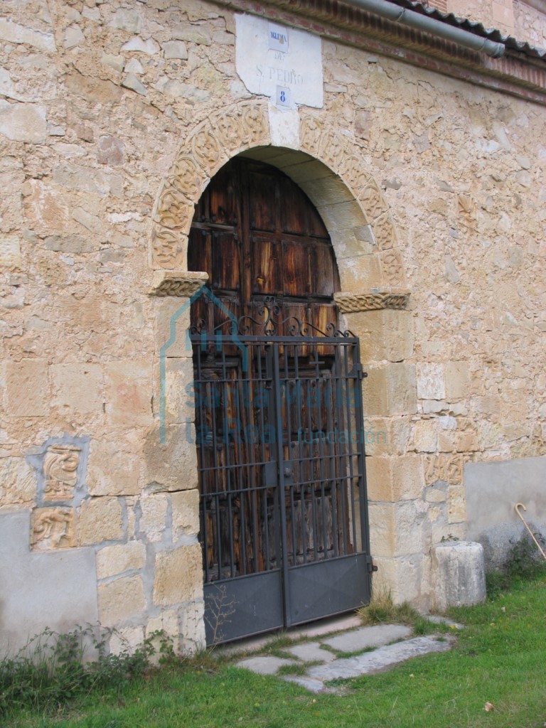 LA IGLESIA SE ENCUENTRA UBICADA unos 200 m alejada del caserío en la parte izquierda de la carretera que conduce hacia Pedraza. Rodeada de un pequeño murete con cruces de calvario fechadas a finales del siglo XVIII, la iglesia presenta una estructura que en algún momento pudo ser románica, aunque el paso del tiempo y las diferentes obras han modificado sustancialmente su primitivo aspecto. Lo que podemos ver en la actualidad es un templo construido en su mayor parte con mampostería salvo los sillares que se emplean en la esquinas, cabecera semicircular de gran altura, una sola nave, con torre adosada en el lado norte y una larga estancia rectangular ubicada en el lado sur que se compartimenta en otras cuatro para albergar una sacristía, una pequeña capilla dedicada a la Virgen del Carmen, el portal de entrada al templo y el baptisterio. Como ya hemos señalado anteriormente la cabecera de la iglesia se construye de mampostería, con un ábside completamente liso sin ventanas y con una cornisa moderna de perfil de gola o cima recta rodeando todo el perímetro de la cabecera. La nave fue reconstruida, aumentando considerablemente su altura, durante la segunda mitad del siglo XIX, en 1865, como reza una placa colocada en la parte superior del muro de la nave. Hoy día, todavía es visible parte de la esquina nororiental del muro de la primitiva fábrica por lo que podemos conocer su altura original y saber que la nave se ha sobreelevado. La torre adosada en el lado norte se construye al igual que el resto del edificio con mampostería y sillares en las esquinas a excepción del último cuerpo en el que se abren las troneras, reconstruido no hace mucho empleando para ello el ladrillo. Existen dos puertas de acceso al templo: en primer lugar la ubicada en la fachada occidental es una portada barroca construida en piedra y presidida por la tiara papal y las llaves, atributo de San Pedro. Una pequeña imagen tallada en piedra blanca del santo titular se coloca en la hornacina central. La otra portada se ubica en el lado meridional, remontada y colocada en esa larga estancia que se añadió a la nave de la iglesia. Cuenta con un arco de medio punto decorado con clípeos formados por tallos anudados cuyo interior se rellena con otros tallos también unidos formando motivos geométricos, rombos y triángulos. Un motivo decorativo de similares características encontramos en la portada conservada en el muro meridional de la iglesia de Nuestra Señora del Carrascal de Pedraza. Apoya el arco en sencillas jambas prismáticas con unas piezas actuando como cimacios en las que se talla un grueso tallo vegetal que se va entrelazando formando circunferencias. Embutidas en el muro, y cercanas a la puerta de acceso encontra mos varias piezas románicas como sillares labrados a hacha, bocel y sobre todo varias dovelas repartidas por la pared. En ellas se tallan por ejemplo un ave apoyada en una rama picoteando un fruto en forma de piña, dos cuadrúpedos uno de ellos erguido completamente sobre sus cuartos traseros mientras el otro apoya sus patas delanteras en una rama, dos cigüeñas una de ellas lleva una serpiente atrapada en su pico y la otra rodeada por una serpiente enredada en sus patas y una última dovela muy llamativa en la que se representa una figura masculina, subida a horcajadas sobre un cuadrúpedo, que sostiene con ambas manos un pesado mazo con el que parece a punto de golpear al animal. Se trata de la representación de la matanza del cerdo, una escena muy característica de los calendarios medievales españoles identificada normalmente con el mes de Noviembre, aunque pensamos que en esta ocasión no tiene nada que ver con la representación del mes, sino que sería un motivo más dentro del repertorio iconográfico que manejaban los maestros escultores de la época. El interior del edificio es muy sencillo, con la nave y la cabecera cubiertas con una falsa bóveda con decoración de yeserías imitando el estilo barroco, fechada en 1892, y que se encuentra en un estado cuando menos preocupante al tener algunas grietas y goteras que, si no se reparan, acabarán afectando a la totalidad de la bóveda. En la estancia del baptisterio ubicada en el ángulo suroccidental de la iglesia encontramos la pila bautismal románica (131 cm x 103 cm x 46 cm) de copa semiesférica decorada con 27 gallones sobre los cuales se talla una cenefa vegetal compuesta por pequeños tallos que se unen formando círculos dentro de los cuales se disponen pequeñas hojas. La embocadura interna es abocelada mientras que la externa lleva tallado un fino sogueado. El pie de la copa está decorado con franjas verticales dentro de las cuales se tallan parejas de hojas dispuestas horizontalmente. La unión entre el pie y la copa se adorna también con un grueso cordón. Encontramos otras pilas similares en cuanto a la morfología y ornamentación en iglesias segovianas, por ejemplo en la iglesia de San Juan en Pedraza, en la iglesia parroquial de Caballar o en la iglesia de Santiago en Turégano.