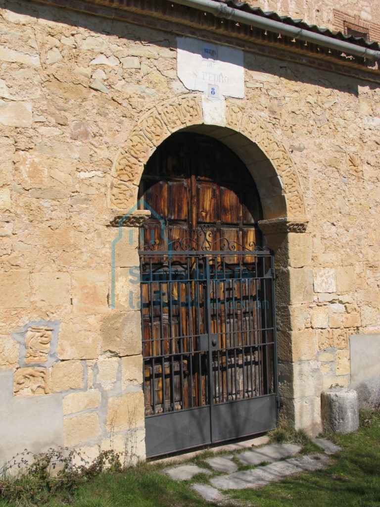 LA IGLESIA SE ENCUENTRA UBICADA unos 200 m alejada del caserío en la parte izquierda de la carretera que conduce hacia Pedraza. Rodeada de un pequeño murete con cruces de calvario fechadas a finales del siglo XVIII, la iglesia presenta una estructura que en algún momento pudo ser románica, aunque el paso del tiempo y las diferentes obras han modificado sustancialmente su primitivo aspecto. Lo que podemos ver en la actualidad es un templo construido en su mayor parte con mampostería salvo los sillares que se emplean en la esquinas, cabecera semicircular de gran altura, una sola nave, con torre adosada en el lado norte y una larga estancia rectangular ubicada en el lado sur que se compartimenta en otras cuatro para albergar una sacristía, una pequeña capilla dedicada a la Virgen del Carmen, el portal de entrada al templo y el baptisterio. Como ya hemos señalado anteriormente la cabecera de la iglesia se construye de mampostería, con un ábside completamente liso sin ventanas y con una cornisa moderna de perfil de gola o cima recta rodeando todo el perímetro de la cabecera. La nave fue reconstruida, aumentando considerablemente su altura, durante la segunda mitad del siglo XIX, en 1865, como reza una placa colocada en la parte superior del muro de la nave. Hoy día, todavía es visible parte de la esquina nororiental del muro de la primitiva fábrica por lo que podemos conocer su altura original y saber que la nave se ha sobreelevado. La torre adosada en el lado norte se construye al igual que el resto del edificio con mampostería y sillares en las esquinas a excepción del último cuerpo en el que se abren las troneras, reconstruido no hace mucho empleando para ello el ladrillo. Existen dos puertas de acceso al templo: en primer lugar la ubicada en la fachada occidental es una portada barroca construida en piedra y presidida por la tiara papal y las llaves, atributo de San Pedro. Una pequeña imagen tallada en piedra blanca del santo titular se coloca en la hornacina central. La otra portada se ubica en el lado meridional, remontada y colocada en esa larga estancia que se añadió a la nave de la iglesia. Cuenta con un arco de medio punto decorado con clípeos formados por tallos anudados cuyo interior se rellena con otros tallos también unidos formando motivos geométricos, rombos y triángulos. Un motivo decorativo de similares características encontramos en la portada conservada en el muro meridional de la iglesia de Nuestra Señora del Carrascal de Pedraza. Apoya el arco en sencillas jambas prismáticas con unas piezas actuando como cimacios en las que se talla un grueso tallo vegetal que se va entrelazando formando circunferencias. Embutidas en el muro, y cercanas a la puerta de acceso encontra mos varias piezas románicas como sillares labrados a hacha, bocel y sobre todo varias dovelas repartidas por la pared. En ellas se tallan por ejemplo un ave apoyada en una rama picoteando un fruto en forma de piña, dos cuadrúpedos uno de ellos erguido completamente sobre sus cuartos traseros mientras el otro apoya sus patas delanteras en una rama, dos cigüeñas una de ellas lleva una serpiente atrapada en su pico y la otra rodeada por una serpiente enredada en sus patas y una última dovela muy llamativa en la que se representa una figura masculina, subida a horcajadas sobre un cuadrúpedo, que sostiene con ambas manos un pesado mazo con el que parece a punto de golpear al animal. Se trata de la representación de la matanza del cerdo, una escena muy característica de los calendarios medievales españoles identificada normalmente con el mes de Noviembre, aunque pensamos que en esta ocasión no tiene nada que ver con la representación del mes, sino que sería un motivo más dentro del repertorio iconográfico que manejaban los maestros escultores de la época. El interior del edificio es muy sencillo, con la nave y la cabecera cubiertas con una falsa bóveda con decoración de yeserías imitando el estilo barroco, fechada en 1892, y que se encuentra en un estado cuando menos preocupante al tener algunas grietas y goteras que, si no se reparan, acabarán afectando a la totalidad de la bóveda. En la estancia del baptisterio ubicada en el ángulo suroccidental de la iglesia encontramos la pila bautismal románica (131 cm x 103 cm x 46 cm) de copa semiesférica decorada con 27 gallones sobre los cuales se talla una cenefa vegetal compuesta por pequeños tallos que se unen formando círculos dentro de los cuales se disponen pequeñas hojas. La embocadura interna es abocelada mientras que la externa lleva tallado un fino sogueado. El pie de la copa está decorado con franjas verticales dentro de las cuales se tallan parejas de hojas dispuestas horizontalmente. La unión entre el pie y la copa se adorna también con un grueso cordón. Encontramos otras pilas similares en cuanto a la morfología y ornamentación en iglesias segovianas, por ejemplo en la iglesia de San Juan en Pedraza, en la iglesia parroquial de Caballar o en la iglesia de Santiago en Turégano.