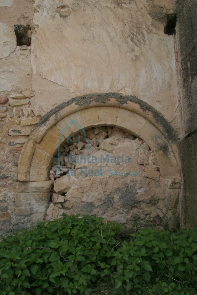 SOBRE LA IGLESIA PARROQUIAL, antes dedicada a Nuestra Señora de la Asunción, señala el antes referido Pascual Madoz que “es un edificio bastante regular y sólido, construido, según una inscripción que se ve en la torre, en el año de 1557; todo de piedra cantería, con bóveda de panderete y bastantes molduras de yeso; tiene una sola nave con 78 pies de long(itud), por 37 de lat(itud), con su buen crucero, y cinco altares de regular construcción”. Es un edificio de notables proporciones, con planta de cruz latina, levantado fundamentalmente en mampostería combinada con sillería en la torre dispuesta a los pies de la fachada meridional, y en los contrafuertes de la fachada norte; con ladrillo se levantó el hoy arruinado cimborrio, cerrado con una cúpula. Fue alzado en época moderna respetando el ancho de la nave y escasos restos de otro románico precedente, y hoy se encuentra inmerso en un lento proceso de restauración que trata de recuperarlo del estado de ruina. Tales obras, y otras que constan a principios del siglo XVII, dejaron en anecdóticos los testimonios románicos de la iglesia, que se reducen a una pequeña portada en la fachada septentrional, un lienzo del muro sur de la nave primitiva, muy reformado aunque aún coronado por los canes a bisel de su cornisa, y parte de la galería porticada que recubría tal fachada, amén de otros restos dispersos de menor entidad y numerosos sillares labrados a hacha, algunos de aristas aboceladas. La semienterrada y hoy cegada portada septentrional consta de arco de medio punto liso y una arquivolta con cuarto de bocel, apeando el primero en una pareja de columnas muy desgastadas. Sí es visible el capitel más occidental, simple cesta troncocónica sin decoración, y el cimacio que lo corona, ornado con tetrapétalas en clípeos y zarcillos, de tratamiento similar a los vistos en la torre de San Miguel de Turégano, entre otros muchos ejemplos. De la galería porticada restan cuatro arcos en pie así como el arranque de un quinto, cegados al reutilizarse la estructura como muro de cierre de la antigua sacristía. Desde el interior de ésta se observa el pretil abocelado sobre el que se alzan las dobles columnas que soportaban los arcos de medio punto, siendo sólo parcialmente visibles los capiteles, todos vegetales y bajo cimacio de nacela, decorados con amplias hojas lobuladas de nervio central hendido y astrágalo facetado, en dos casos dividida la cesta en dos pisos, el inferior liso y separado del vegetal por un junquillo. Los fustes visibles son monolíticos, y apoyan en basas áticas de grueso toro inferior. La cuidada talla de estas piezas, donde se recurre al uso del trépano, parece llevar a fechas tardías dentro del siglo XII o primeras décadas del XIII la construcción de la galería. En el piso bajo de la torre, situada al sur y que reutiliza los muros de una espadaña anterior, se reaprovechó como ménsula un capitel románico de amplias hojas de helecho y marcadas nerviaciones, con remate de volutas y similar tratamiento a los del pórtico, de donde quizás proceda.