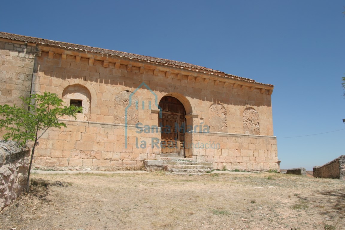SE EMPLAZA EN LA ZONA MÁS ELEVADA DEL CASERÍO, dispuesto en ladera al sur del templo. Conserva de su estructura original la cabecera y el pórtico, tras el hundimiento que sufrió a mediados del pasado siglo y que afectó sobre todo a la nave. Muestra planta basilical y nave única coronada por cabecera compuesta de tramo recto y ábside semicircular, con portada abierta al mediodía y protegida por un sencillo pórtico de arcos hoy cegados. La cabecera se levantó en mampostería con sillares en los codillos, enfoscada al exterior y totalmente revocada con yeso al interior, rematándose sus muros por cornisa de caveto sobre canes lisos de idéntico perfil. En el eje se abría una saetera hoy cegada, rodeada por ventana de arco de medio punto con junquillo en la arista y chambrana de nacela. Apea el arco en una pareja de columnas acodilladas sobre degeneradas basas áticas y coronadas por toscos capiteles, cuyas cestas, bajo cimacio nacelado, se ornan con retícula de dados y rombos. Al interior, el presbiterio se cubre con bóveda de cañón y el hemiciclo con horno, ambas sobre impostas de nacela. Dos grandes arcos apuntados ciegos animan los paramentos laterales del tramo recto, al que da acceso desde la nave un deformado arco de triunfo de medio punto y doblado, que apea en una pareja de columnas entregas cuyos capiteles, aparentemente lisos, están recubiertos por completos de yeso. La nave es fruto de la reciente reconstrucción, cerrándose con cinco tramos de moderna bóveda de cañón de ladrillo, separados por fajones sobre pilastras, en sustitución de la primitiva cubierta de madera. En el cuarto tramo del muro meridional se abre la remontada y también moderna portada, de arco de medio punto y chambrana de nacela. Otro arco sobre impostas de listel y bocel, quizá procedente de la portada original, fue recolocado en la fachada meridional, tras el pórtico. El pórtico meridional, aun siendo acorde con la extrema simplicidad del conjunto, manifiesta una mejor factura. Se levantó en bien escuadrada sillería, alzándose sobre un alto zócalo de aristas aboceladas. Consta de dos accesos idénticos, uno abierto al sur y el otro -hoy cegado- al este, los dos de arco de medio punto liso sobre impostas de nacela, mientras que a ambos lados del ingreso meridional se disponen dos arcos lisos de medio punto sobre robustos machones prismáticos. Se corona la estructura con cornisa de caveto, sobre canes con uno o tres rollos, perfil de proa de nave o simple nacela. Por su simplicidad, recuerda al remontado de San Bartolomé de Sepúlveda, el también muy modificado de Aldealengua de Santa María, el de Santa María de Riaza, éste desarrollado por toda la fachada y probablemente algo más tardío, o a la economía extrema del de la Virgen del Barrio de Navares de las Cuevas. A los pies, bajo el coro y protegida por reja de madera, se conserva la pila bautismal, de traza románica y copa semiesférica de 102 cm de diámetro por 52 cm de altura, con el frente ornado con gallones y dos junquillos en la embocadura, sobre pilar cilíndrico y zócalo abiselado.