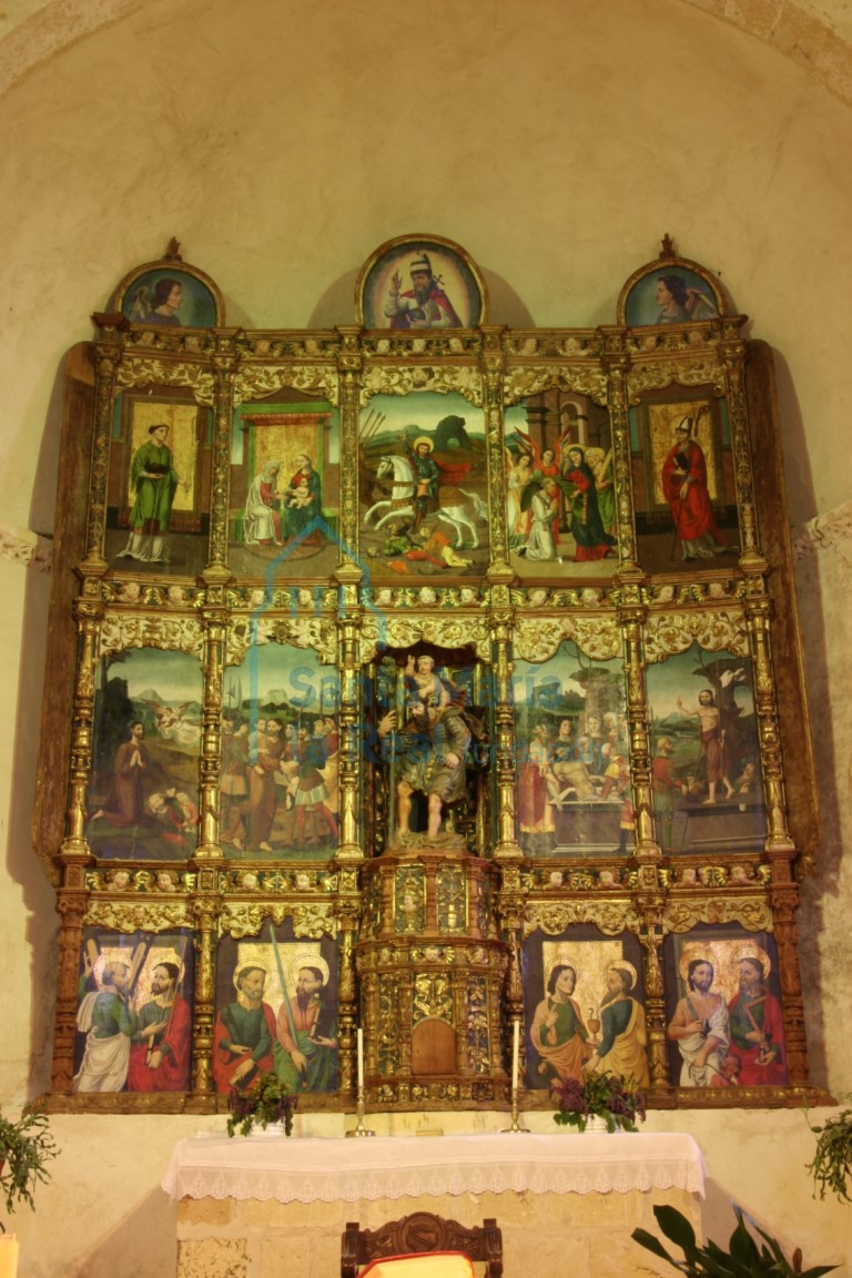 LA PARROQUIA DE LA CUESTA domina por el norte el caserío desde lo alto de la loma sobre la que se asienta la localidad y que le da nombre, constituyendo un magnífico mirador de todo el alto Pirón. A la inversa, tanto desde la carretera que faldea la Sierra en dirección a Soria como desde las ruinas de Santa María de la Sierra o la carretera que conduce a Cubillo, se contempla la iglesia majestuosa y emergente de su entorno. El templo, de planta basilical, presenta tras su ampliación a principios del siglo XVI tres naves, cerradas las colaterales a un agua y la central con artesa, comunicándose entre sí mediante dos parejas de amplios formeros, apuntados y moldurados con boceles y mediascañas los que dan a la nave del evangelio y de medio punto y achaflanados los de la sur, apeando los primeros en un pilar cúbico y los otros en uno de sección octogonal. Tal diversidad nos hace pensar que la ampliación de la nave tuvo lugar en dos momentos sucesivos, probablemente en el siglo XV la norte y a principios del XVI la meridional. También tardogótica es la capilla añadida al sur de la cabecera, rematando la nave de la epístola, de planta cuadrada y cubierta por bóveda de crucería con terceletes y ligaduras, claves con cresterías y sobre ménsulas decoradas con bolas. Preside el retablillo barroco de su testero, datado en 1709, un magnífico Crucificado gótico. Finalizan los añadidos a la fábrica original con el de un husillo que alberga una escalera de caracol para dar acceso al primer piso de la torre, adosado a su cara oriental. El conjunto, tanto la obra románica como los añadidos, se levantó en mampostería, reservándose el sillar para los esquinales, encintado de vanos y portadas. Pese a la diversidad de campañas, estas trasformaciones respetaron la cabecera original y en lo fundamental las dos fachadas laterales de la obra románica, trasladando aleros y portadas a su nueva ubicación. La cabecera, alzada sobre banco de sillería de aristas matadas por bocel, se compone de presbiterio con sus paramentos laterales animados por dobles arquerías lisas de medio punto, sobre las que corre la imposta de tetrapétalas en clípeos encima de la que voltea la bóveda de cañón que cubre el tramo. Dicha imposta se sigue en el hemiciclo, éste cerrado con bóveda de horno y que alberga un magnífico retablo que en su piso inferior reutiliza tablas góticas de otro anterior, con un fragmentario apostolado. Da paso a la cabecera un arco triunfal de medio punto y doblado, que apea en machones con una pareja de columnas entregas, sobre zócalos, plintos y basas áticas de grueso toro inferior aplastado. Las rematan bellos capiteles, el del lado del evangelio, bajo cimacio de rosetas, se decora con dos parejas de arpías de largos cuellos afrontadas, mientras un personaje con túnica corta cabalga sobre los lomos de las centrales, a las que ase por el cuello; el del lado de la epístola recibe acantos rematados por prominentes volutas y piso superior de caulículos, bajo cimacio de tallos entrelazados y espinosas palmetas pectiformes. Al exterior, el ábside muestra su mampostería revocada con cemento moderno imitando el despiece de sillares, con su hoy cegada ventana de saetera rodeada por arco de medio punto sobre impostas de nacela. Lo corona una cornisa que repite las flores de cuatro pétalos en clípeos vistas en el interior, sostenida por canes con lobuladas hojas picudas, prótomos de cérvidos y bóvidos, estilizados grifos rampantes y, junto al codillo septentrional, un curioso asno tocando la lira -repetido quizás en otra pieza muy desgastada del mismo hemiciclo- y una cigüeña. Aunque la adición de la capilla gótica torna difícil la visión de los canes del muro sur del presbiterio, reconocemos en ellos un descabezado león recostado, un acróbata y una acuclillada parturienta únicamente ataviada con velo y toca, como los anteriores, de buena factura. La fachada meridional, rodeada por el camposanto, muestra su hoy cegada portada abierta en un antecuerpo de sillería, con recubierto arco de medio punto y dos arquivoltas, la interior moldurada con tres cuartos de bocel en esquina retraído y la otra lisa, rodeada por chambrana de triple hilera de finos billetes. Apean los arcos en jambas escalonadas en las que se acodilla una pareja de columnas de semienterradas basas áticas y capiteles animalísticos. En el izquierdo del espectador vemos una pareja de leones afrontados y encorvados, mientras que en el otro -de perdido fuste- se afrontan dos parejas de estilizados grifos rampantes enredados en tallos, que con sus cuerpos dibujan formas acorazonadas, según modelo recurrente en el románico del Pirón y entorno de la capital. Los cimacios, que se ornan con tallos entrelazados, dibujando formas geométricas en el segundo caso, se continúan por el antecuerpo como imposta de palmetas pectiformes en tallos del tipo visto en el cimacio del capitel sur del triunfal. La reaprovechada cornisa repite las tetrapétalas caladas en clípeos, sobre una interesante serie de canecillos por desgracia de maltrecho relieve y diferentes calidades de talla. Además de algunos vegetales, entrelazos y prótomos de bóvidos, vemos en ellos, junto a músicos y acróbatas, y una serie de bustos humanos en diferentes actitudes de difícil interpretación, entre ellos un rústico con caperuza, otros frontales, uno realizando una mueca con la boca, a su lado una figura con el gesto de desesperación de asirse la muñeca derecha, cuya mano se lleva a la garganta, otro personaje mostrando un libro abierto, un híbrido de cuerpo de ave y cabeza felina que muerde su cola de reptil, una figura blandiendo un garrote, un lector, aves, esfinges, un grifo, un arquero disparando una flecha, una liebre y una máscara monstruosa de larga barba partida y aire demoníaco. También en la fachada septentrional se trasladó parte del alero y la portada, que repite fielmente el esquema de la antes descri