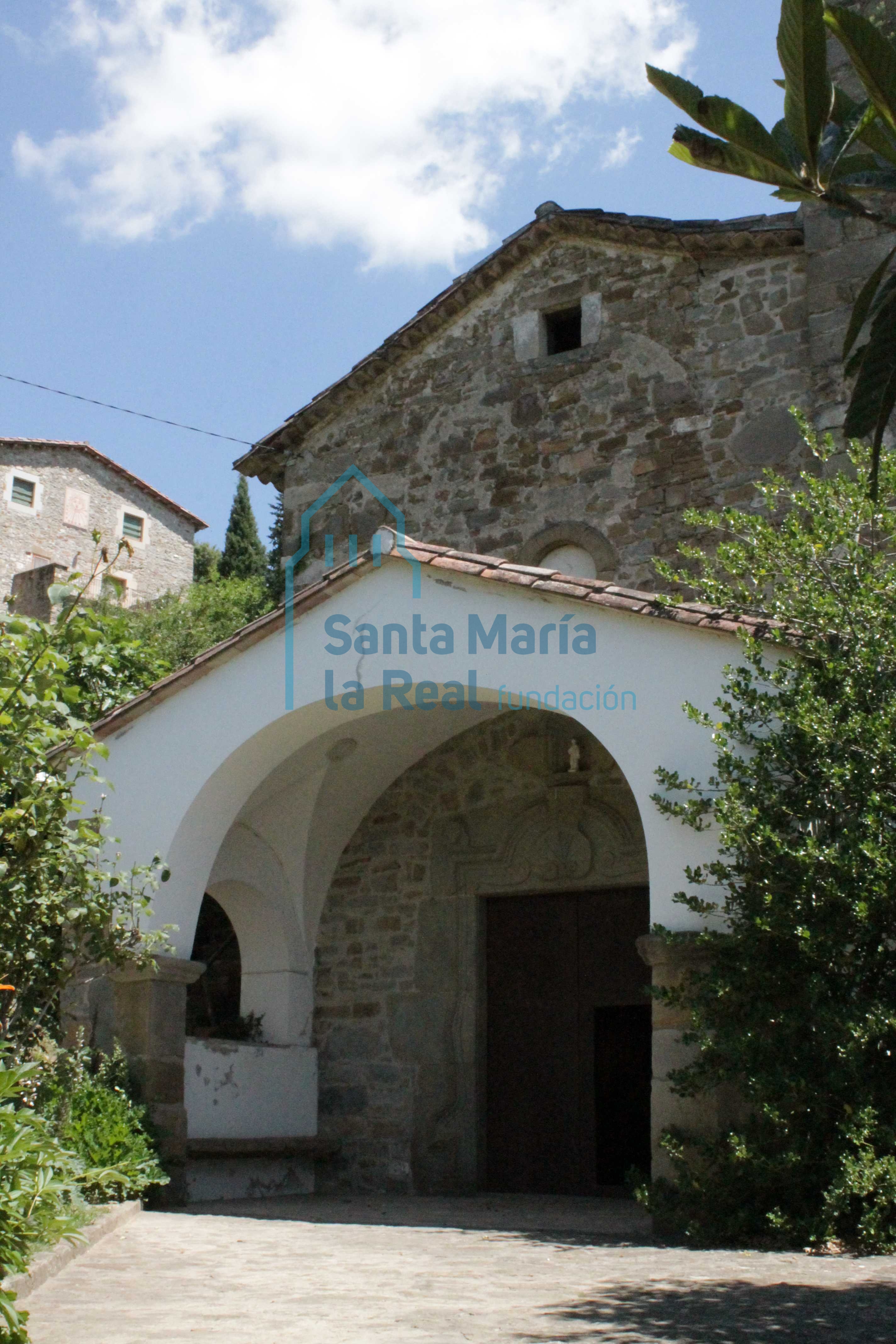 La fachada de la iglesia se encuentra en el muro oeste, precedida por un atrio cuya construcción data de la misma época que la portada, situada en el centro. En el muro norte encontramos unas escaleras que conducen hacia el sobrealzado de la iglesia. La portada y el atrio son de filiación tardobarroca. La luz de la entrada es rectangular, y en su dintel se encuentra gravada la fecha de 1759. En la portada encontramos la inscripción latina Vere non est hic alivd nisi domus dei et porta celi. En el atrio, cubierto por una bóveda de crucería, se ha utilizado como motivo decorativo un par de conchas que recuerdan a la concha o vieira del camino de Santiago.