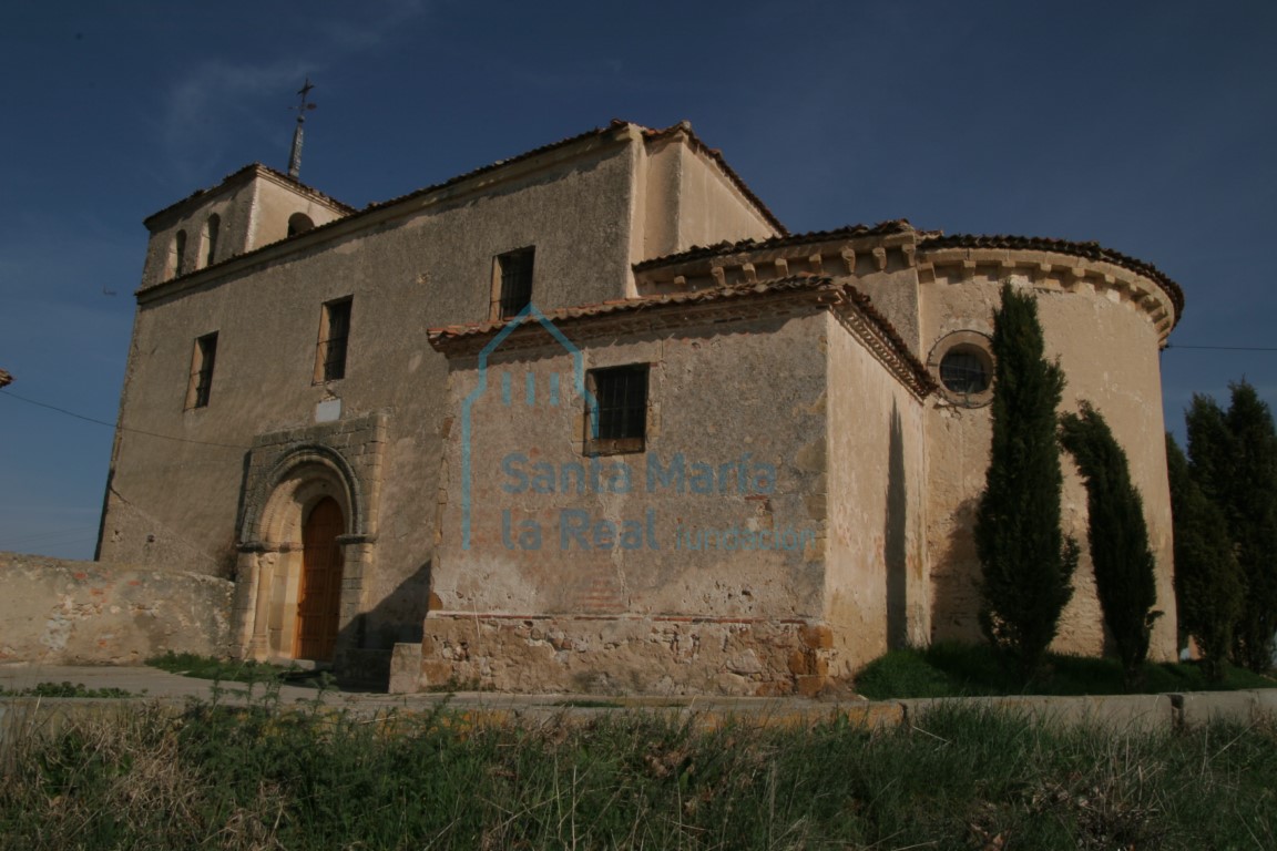 EL TEMPLO SE ENCUENTRA edificado en la parte más alta del pueblo, en una “rápida pendiente” como cita Madoz mientras que el resto de construcciones se disponen escalonadamente por la falda sur de una pequeña colina. De hecho es muy posible que la situación de la iglesia condicionase la posterior organización espacial de todo el pueblo. El acceso se realiza por una empinada calle que desemboca directamente en la portada del templo y en el terreno que lo rodea. Originalmente era un templo que seguía un esquema típico del románico rural: una sola nave y cabecera formada por ábside y presbiterio. La portada se ubicaba en el lado meridional de la nave. Pero ha sufrido numerosas modificaciones a lo largo de la historia que han alterado considerablemente este esquema inicial. Por un lado se adosó una torre en el muro occidental mientras que en el muro sur del presbiterio se construyó una estancia cuadrangular para ubicar en ella la sacristía; por otra parte la nave del templo ha sido totalmente rehecha aunque es imposible precisar el momento de realización de estas obras. Por otra parte, también el entorno que rodeaba el templo se ha visto alterado al construirse un cementerio en el lado norte adosado a la iglesia y en la parte occidental casas que se utilizan como viviendas privadas, una de ellas la antigua casa parroquial. Tan sólo conservamos de la fábrica original románica la cabecera y la portada. La cabecera como ya hemos dicho está compuesta por ábside y presbiterio y construida con mampostería enfoscada a excepción de los esquinales en los que se emplea sillería y en la cornisa achafla nada y en la colección de canecillos que la sustentan, todos ellos con perfil de nacela a excepción de cuatro de proa de barco. El tambor del ábside carece de ventanas a excepción de un pequeño óculo que se abre en la parte sur y que probablemente fue construido para iluminar el templo cuando se coloca el retablo en el ábside. La portada, remontada respecto a su ubicación original, está ubicada aproximadamente en mitad de la nave, ligeramente adelantada con respecto al muro de ésta. Tiene un arco de medio punto con dos arquivoltas decoradas ambas con un grueso bocel flanqueado por dos filas de pequeñas puntas de diamante. La primera arquivolta apoya en columnas elevadas sobre un alto plinto, mientras que la segunda lo hace en jambas prismáticas. Los capiteles que coronan las columnas se encuentran muy erosionados siendo muy dificultoso intuir las formas que en ellos se tallan; en uno de ellos, el que peor estado presenta, es posible que se esculpan dos animales aunque es imposible precisar si se trata de aves o cuadrúpedos. En la otra cesta se representan dos arpías con alas desplegadas, cabellos largos y estirados sobre las alas. Sobre los capiteles los pequeños cimacios decorados con estrellas de cuatro puntas dentro de círculos se acaban convirtiendo en una línea de imposta que se desarrolla por toda la portada. Finalmente una chambrana de tres filas de billetes completa el conjunto rodeando al arco de entrada. Portadas de volúmenes y formato similares encontramos también en la segoviana iglesia de Mata de Quintanar. En el interior del templo, la nave se cubre con bóveda de cañón con lunetos mientras que la cabecera presenta un esquema típico románico con bóveda de cañón para el presbiterio y posiblemente bóveda de horno en el ábside aunque actualmente no podemos verla al taparse esa zona por un retablo barroco. El arco que comunica la nave con la cabecera tiene piezas de sillería quizás reutilizadas de un arco anterior así como las basas que presentan un perfil ático. Los restos románicos conservados nos remiten a una cronología bastante tardía del edificio que bien podría situarse en los primeros años del siglo XIII.