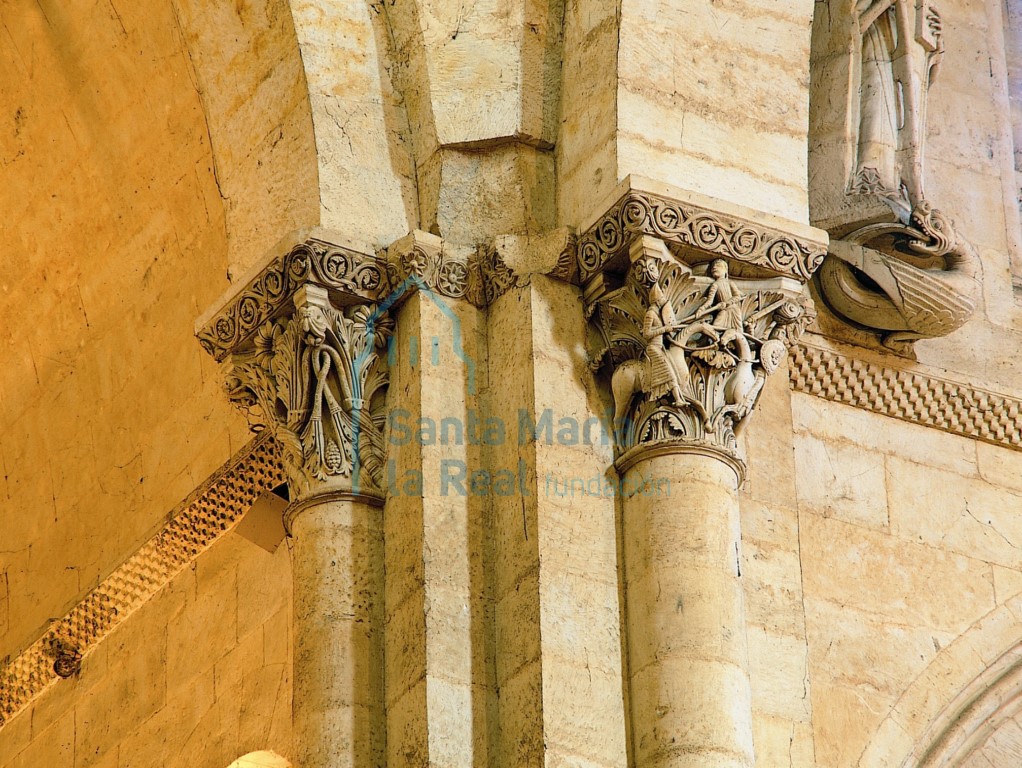 Capitel del muro norte, se figura el tema del personaje sometido a una pareja de grifos, a los que ase por las barbichuelas