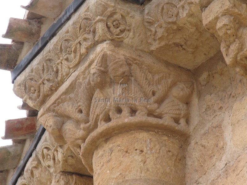 Capitel del lado derecho de la ventana del muro este de la cabecera. Dos figuras con rostros humanos, en sus cabezas parecen llevar tocados. Sus cuerpos son de aves cubiertos de plumas apoyando sobre patas, pudieran ser sirenas-aves